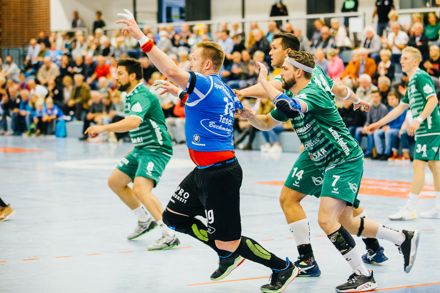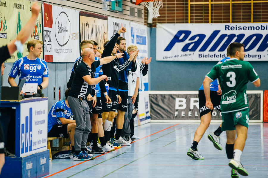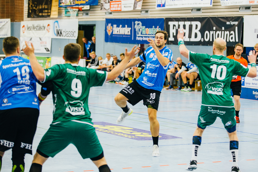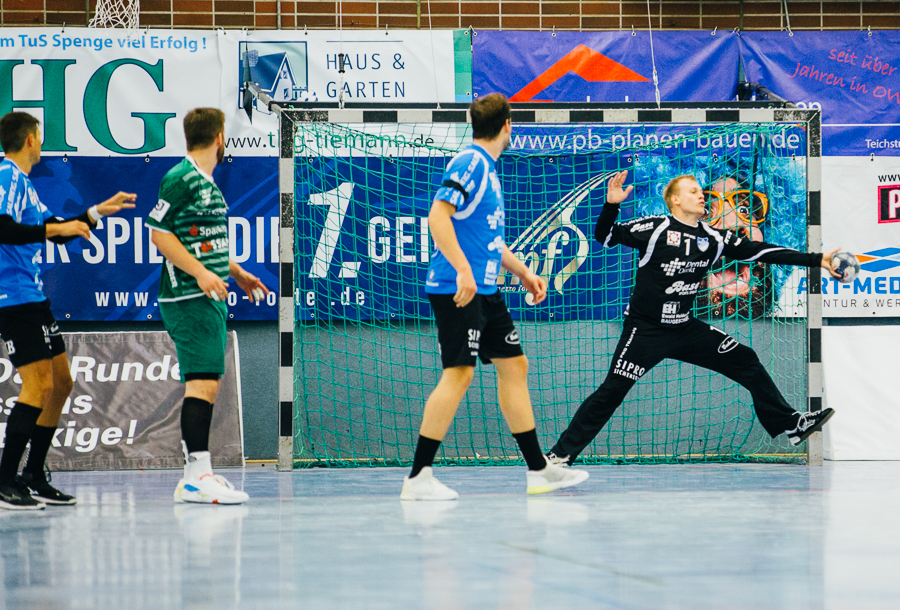 Der Start in die Partie verlief sehr ausgeglichen, beiden Mannschaften war jedoch die lange Pause und die damit verbundene Unsicherheit etwas anzumerken. Bis zum 3:3 ging es somit noch recht verhalten zu, ehe sich der TuS erstmals mit 9:6 absetzen konnte – zu diesem Zeitpunkt erwachte auch die Halle, jedes Tor wurde lautstark beklatscht und so ganz langsam kehrte die «3. Liga-Stimmung« in die Spenger Sporthalle zurück. Besonders unsere Nummer Eins im Tor Bastian Räber konnte sich nun immer wieder mit Paraden auszeichnen und gehörte in der ersten Halbzeit zu den auffälligsten Akteuren in den Reihen des TuS Spenge. Seinen Paraden und den oftmals daraus entstandenen Tempogegenstößen war es mit zu verdanken, das der TuS mit einem guten 17:13 Vorsprung in die Halbzeit ging. Heiko Holtmann: Mit der ersten Halbzeit war ich sehr zufrieden, wenngleich unser Überzahlspiel nicht so funktioniert hat, wie ich es mir vorgestellt habe.