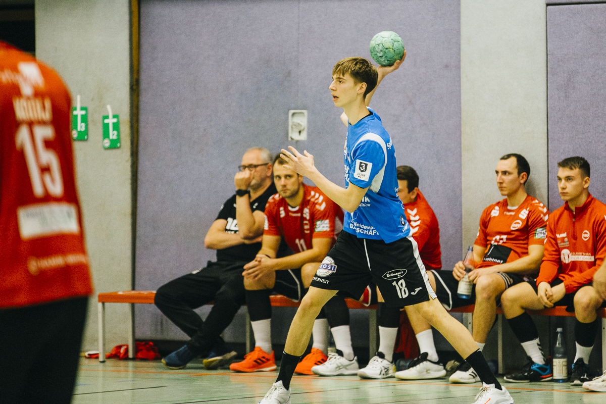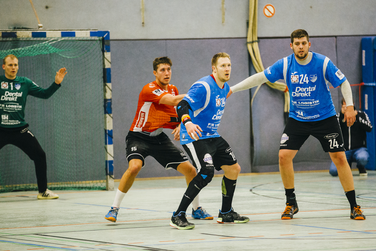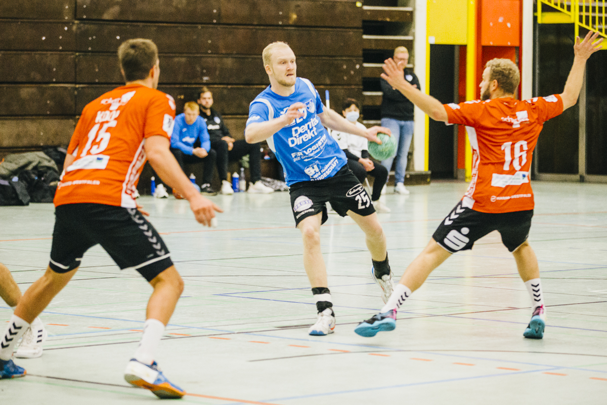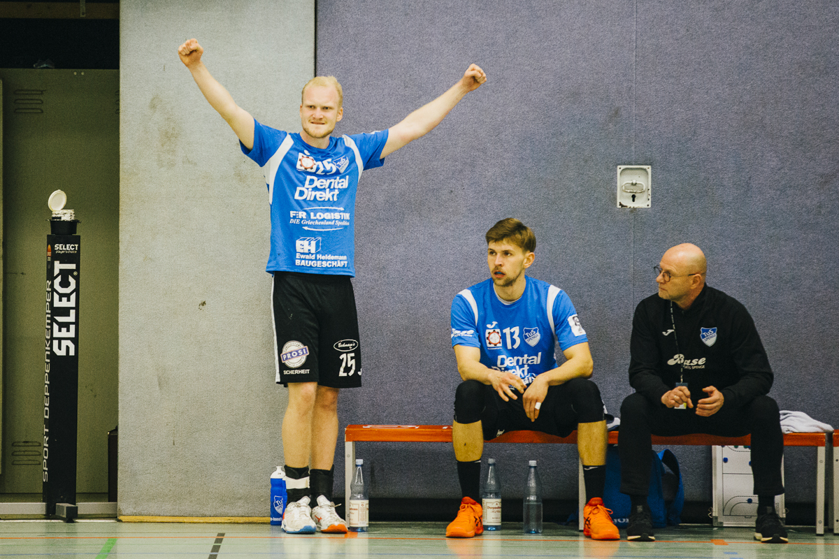 Wie schon in den letzten Spielen setzte Heiko Holtmann in Halbzeit eins auf die gleiche Startformation und Taktik: schnelle Mitte mit dem siebten Feldspieler und Anspiele an den Kreis, entweder auf Oliver Tesch oder Gordon Gräfe. Nach 10 Minuten war das Spiel aber noch völlig ausgeglichen, Spielstand 5:5. In den nächsten 10 Minuten baute unserer Team den Vorsprung Stück für Stück aus. Besonders effektiv waren in dieser Phase die Anspiele von Fabian Breuer und Fynn van Boenigk auf die beiden Außenspieler René Wolff und Sebastian Reinsch. Dazu wurde auch die Abwehr immer griffiger und Bastian Räber zeigte einige starke Paraden. Nach 23 Minuten führte der TuS mit 12:17. Passend mit dem Pausenpfiff traf Vincent Hofmann zum 14:21 – sieben Tore vor.