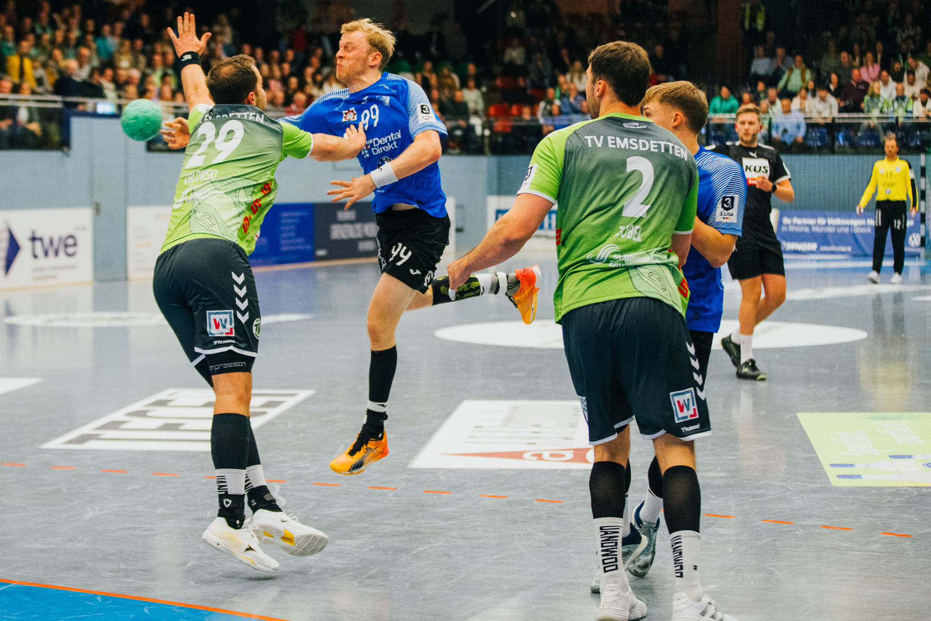 1. Halbzeit: Spenge hatte sich einiges für das Spiel vorgenommen und wollte von Beginn an aggressiv gegen Emsdetten spielen. Vincent Hofman markierte das erste Tor des Abends und hinterließ damit die erste Duftnote in der tollen Emshalle. Bis zur neunten Minute konnte Spenge auch die Vorgaben des Trainers Rafael Jacobsmeier umsetzen. Der TuS stand gut in der Abwehr nur im Angriff ließ die Truppe ein paar Tormöglichkeiten liegen. So führte Emsdetten mit zwei Toren – 7:5. Ab dann setzte sich der Favorit Stück für Stück ab. Immer wieder traf der starke Marian Orlowski (insgesamt 12 Tore) oder er setzte seine Mitspieler gut in Szene. Bei der Emsdettener Auszeit in der 20. Spielminute stand es 14:7. Das TuS-Trainerteam probierte einiges aus um wieder zurück ins Spiel zukommen. Auch die neue Angriffsformation mit sieben Feldspielern konnte den Abstand nur um ein Tor verringern. Emsdettener spielte ohne wenige Fehler weiter und kontrollierte das Spiel. Doch auch eine andere Sichtweise ist möglich. Positiv ausgedrückt für den TuS: Emsdetten erzielte in den letzten 10 Minute nur 5 Tore, Spenge 6 Tore. Halbzeitstand: 19:13. Alles sah nach einem Sieg der Emsdettener aus.