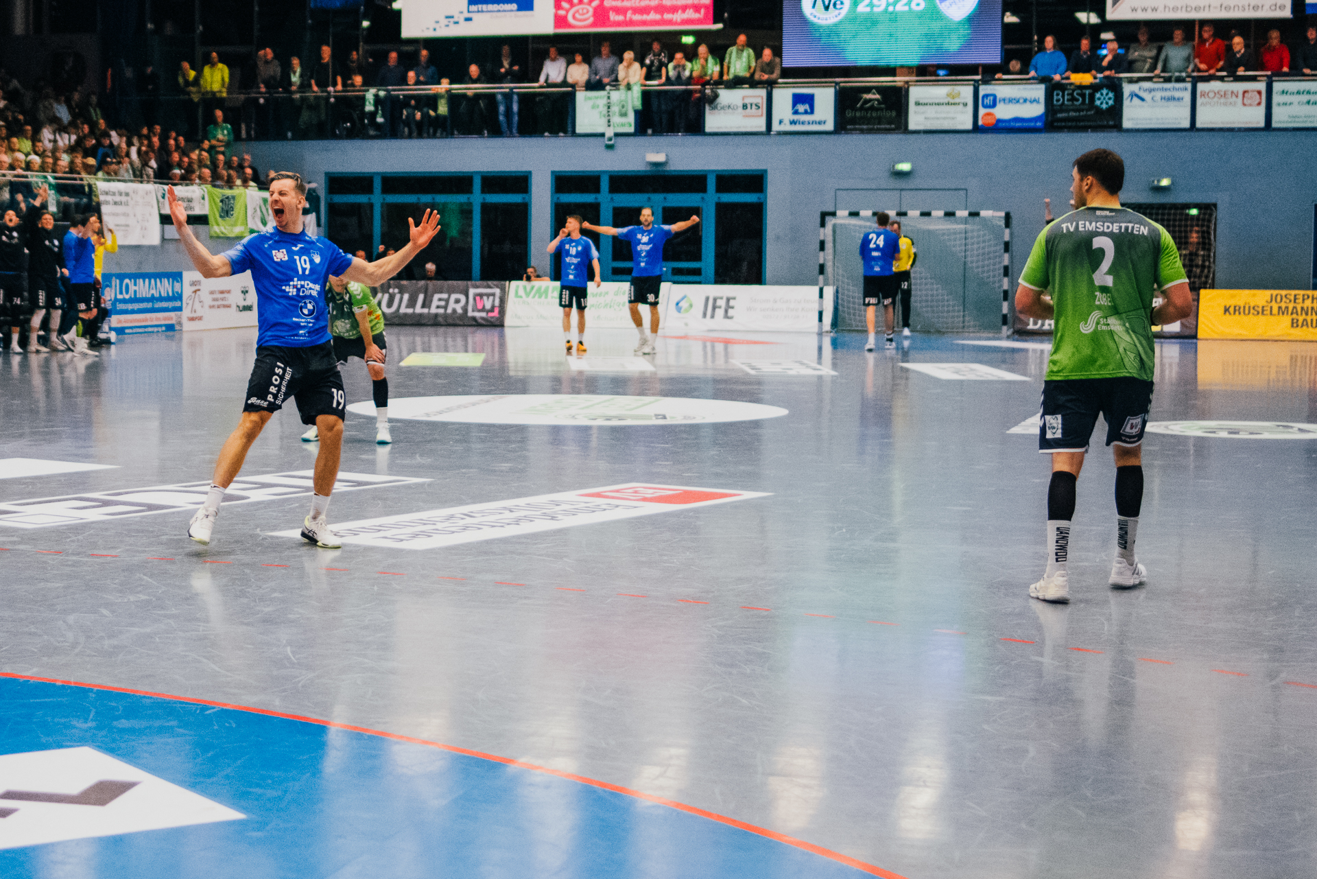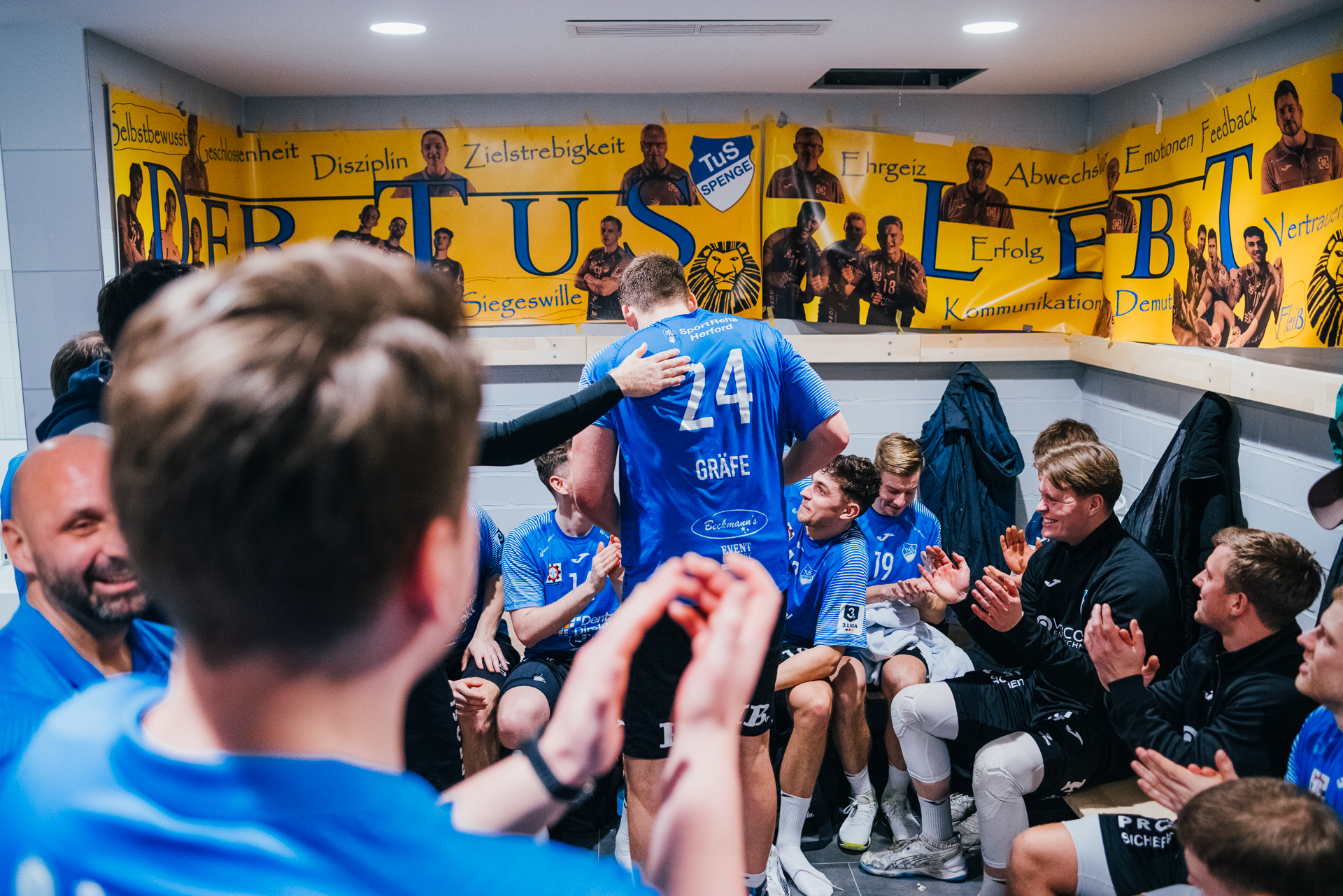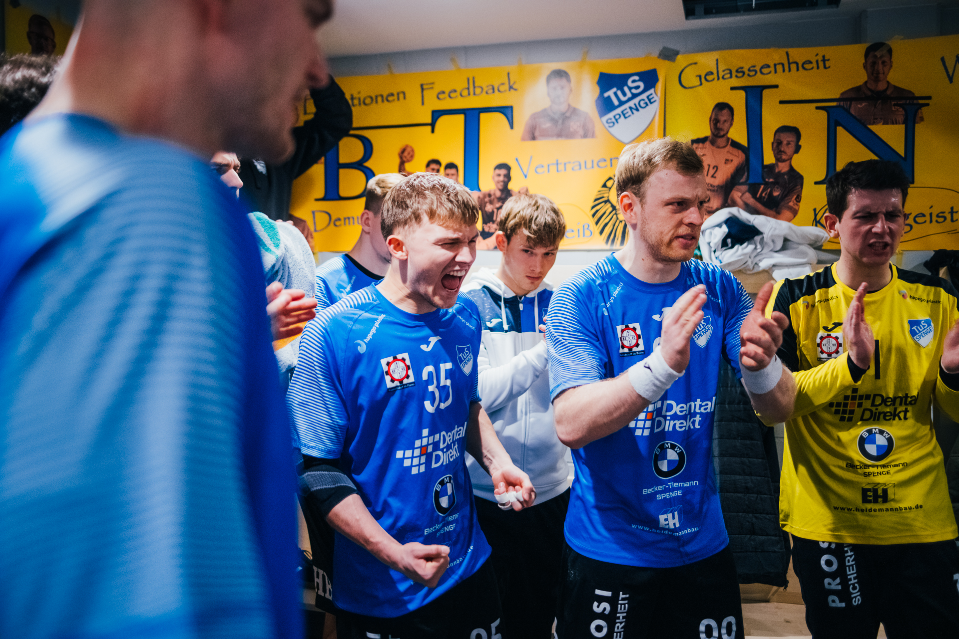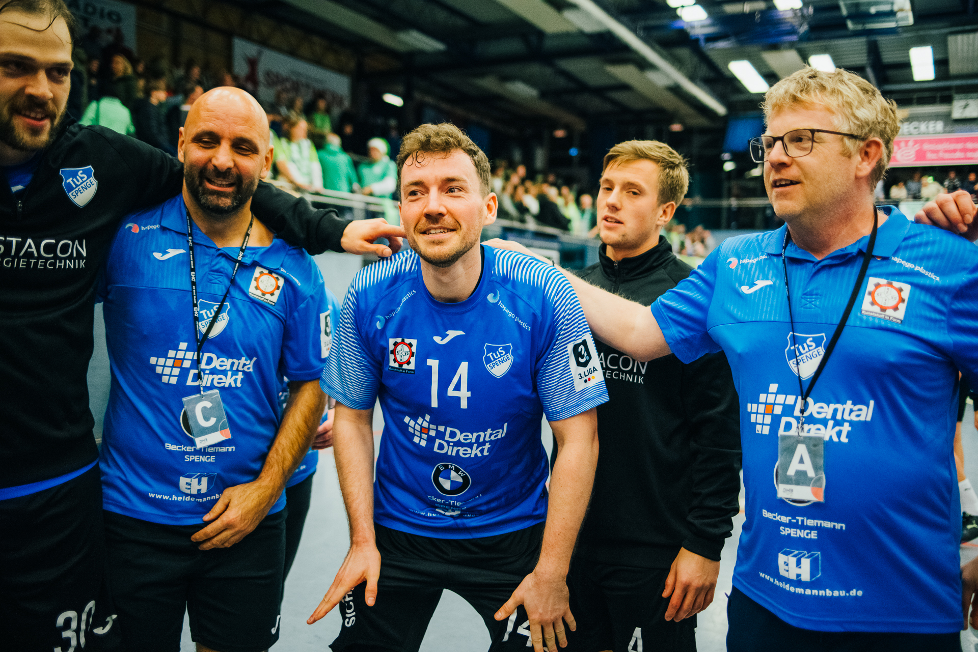 Spenge ließ sich davon nicht beirren und spielte weiter. In der 47. Spielminute war der Ausgleich dann da: Justus Aufderheide traf zum 27:27. Jetzt wurde das Spiel zu einem packendem Drittligaspiel. Der TVE ging immer wieder in Führung, Spenge hielt dagegen und markierte dann den Ausgleich. In dieser heißen Phase bekam Justus Aufderheide in der 57. Minute, beim Spielstand von 33:33 eine umstrittene 2-Minuten-Strafe. Doch Emsdetten nutzte diese Chance nicht. Aber der TuS war da. Bjarne Schulz traf zur ersten TuS-Führung im Spiel – 33:34. Die Spieluhr zeigte 58:24. Marian Orlowski vom TVE markierte 40 Sekunden vor dem End das 34:34. Auszeit TuS. 30 Sekunden blieben dem TuS für einen Torabschluß und auch jetzt wurde der Angriff wieder ruhig vorgetragen. Wenige Sekunden vor dem Ende lief Fabian Breuer mittig auf die Deckung, gab im Sprung an Vincent Hofmann ab. Hofmann warf und traf. Abpfiff. Auswärtssieg. Der TuS tanzte und feierte mit den mitgereisten Fans.