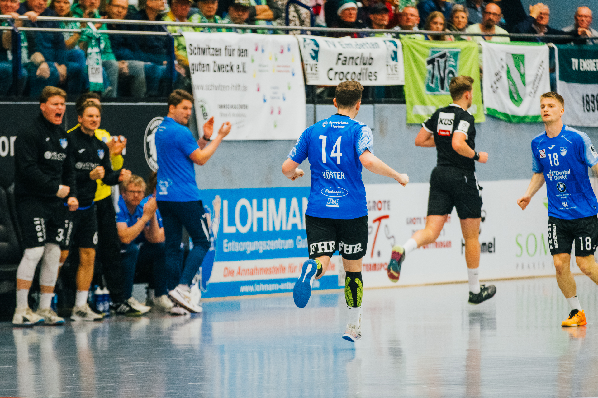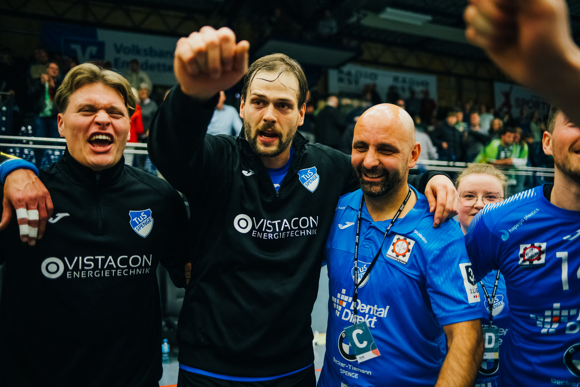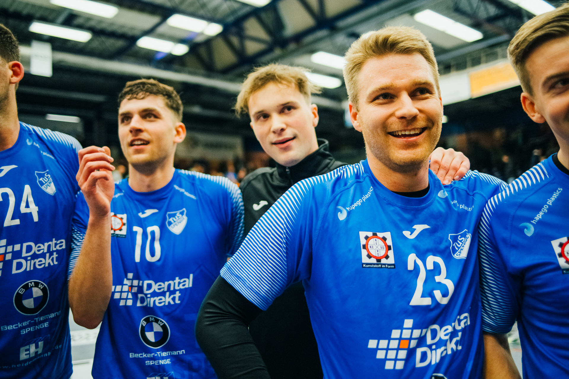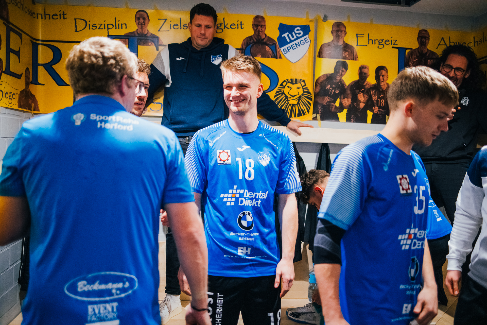 Spenge ließ sich davon nicht beirren und spielte weiter. In der 47. Spielminute war der Ausgleich dann da: Justus Aufderheide traf zum 27:27. Jetzt wurde das Spiel zu einem packendem Drittligaspiel. Der TVE ging immer wieder in Führung, Spenge hielt dagegen und markierte dann den Ausgleich. In dieser heißen Phase bekam Justus Aufderheide in der 57. Minute, beim Spielstand von 33:33 eine umstrittene 2-Minuten-Strafe. Doch Emsdetten nutzte diese Chance nicht. Aber der TuS war da. Bjarne Schulz traf zur ersten TuS-Führung im Spiel – 33:34. Die Spieluhr zeigte 58:24. Marian Orlowski vom TVE markierte 40 Sekunden vor dem End das 34:34. Auszeit TuS. 30 Sekunden blieben dem TuS für einen Torabschluß und auch jetzt wurde der Angriff wieder ruhig vorgetragen. Wenige Sekunden vor dem Ende lief Fabian Breuer mittig auf die Deckung, gab im Sprung an Vincent Hofmann ab. Hofmann warf und traf. Abpfiff. Auswärtssieg. Der TuS tanzte und feierte mit den mitgereisten Fans.