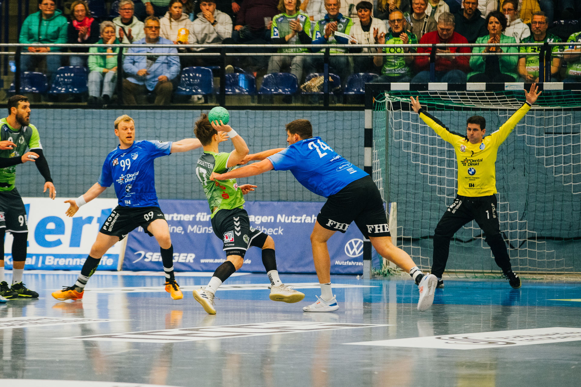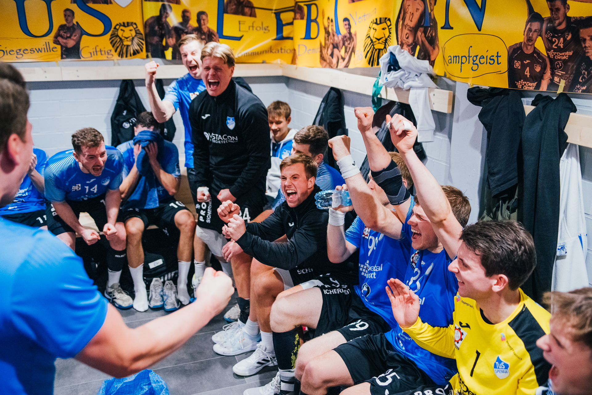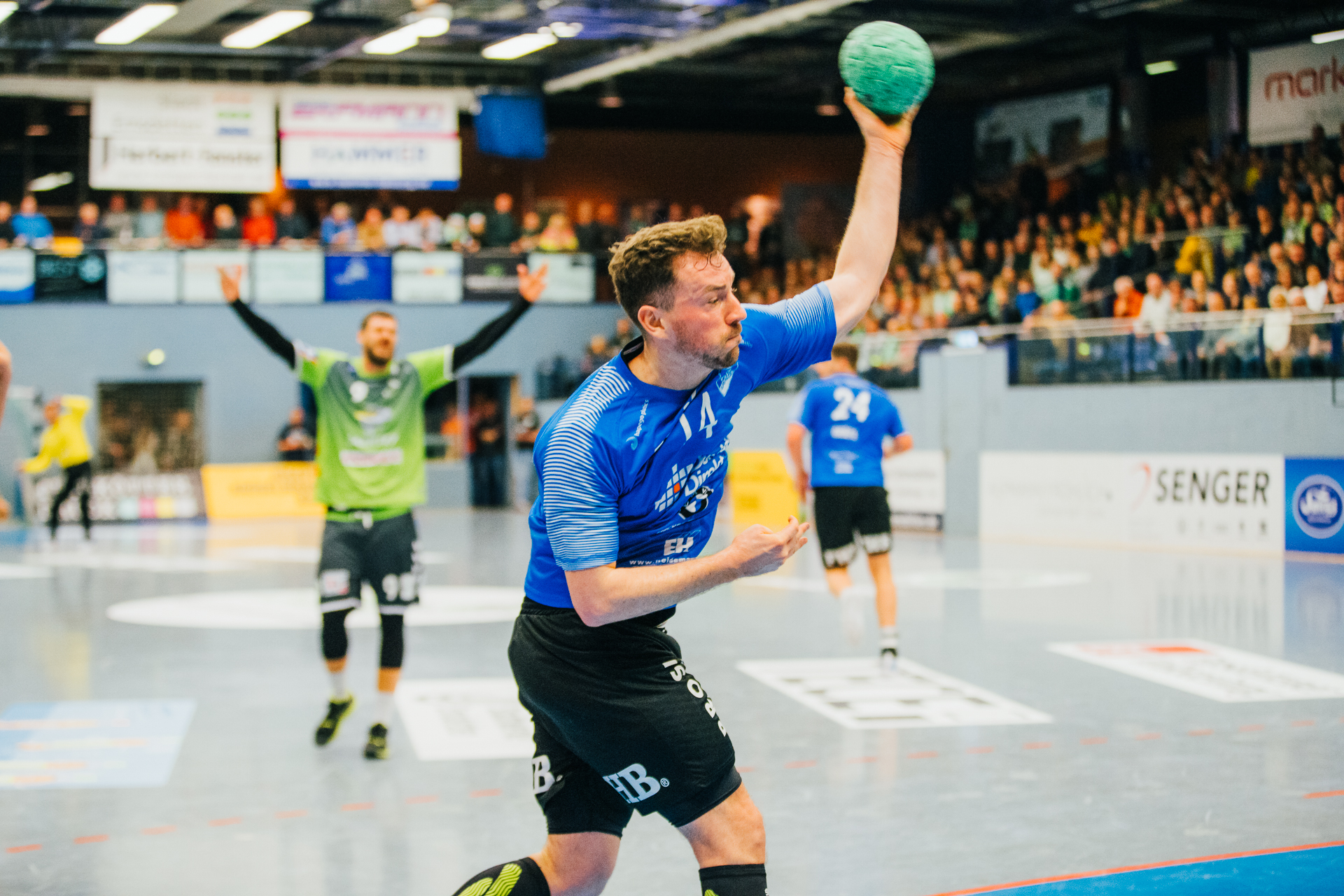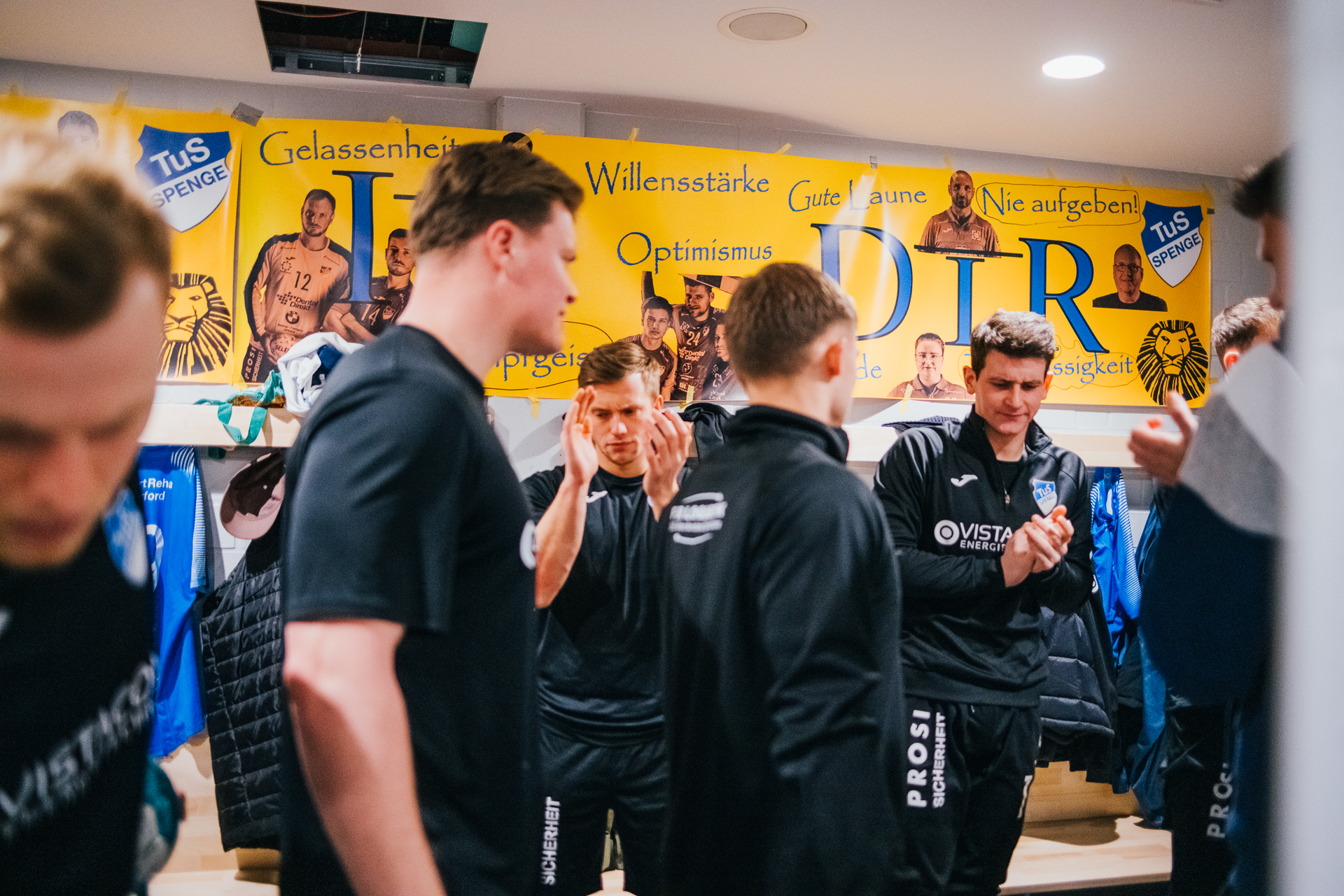 Spenge ließ sich davon nicht beirren und spielte weiter. In der 47. Spielminute war der Ausgleich dann da: Justus Aufderheide traf zum 27:27. Jetzt wurde das Spiel zu einem packendem Drittligaspiel. Der TVE ging immer wieder in Führung, Spenge hielt dagegen und markierte dann den Ausgleich. In dieser heißen Phase bekam Justus Aufderheide in der 57. Minute, beim Spielstand von 33:33 eine umstrittene 2-Minuten-Strafe. Doch Emsdetten nutzte diese Chance nicht. Aber der TuS war da. Bjarne Schulz traf zur ersten TuS-Führung im Spiel – 33:34. Die Spieluhr zeigte 58:24. Marian Orlowski vom TVE markierte 40 Sekunden vor dem End das 34:34. Auszeit TuS. 30 Sekunden blieben dem TuS für einen Torabschluß und auch jetzt wurde der Angriff wieder ruhig vorgetragen. Wenige Sekunden vor dem Ende lief Fabian Breuer mittig auf die Deckung, gab im Sprung an Vincent Hofmann ab. Hofmann warf und traf. Abpfiff. Auswärtssieg. Der TuS tanzte und feierte mit den mitgereisten Fans.