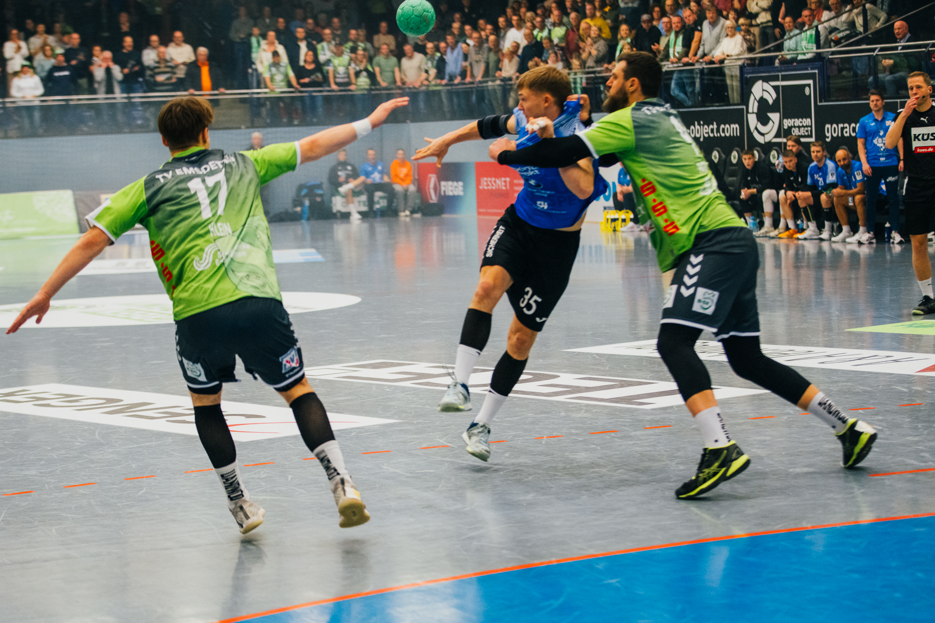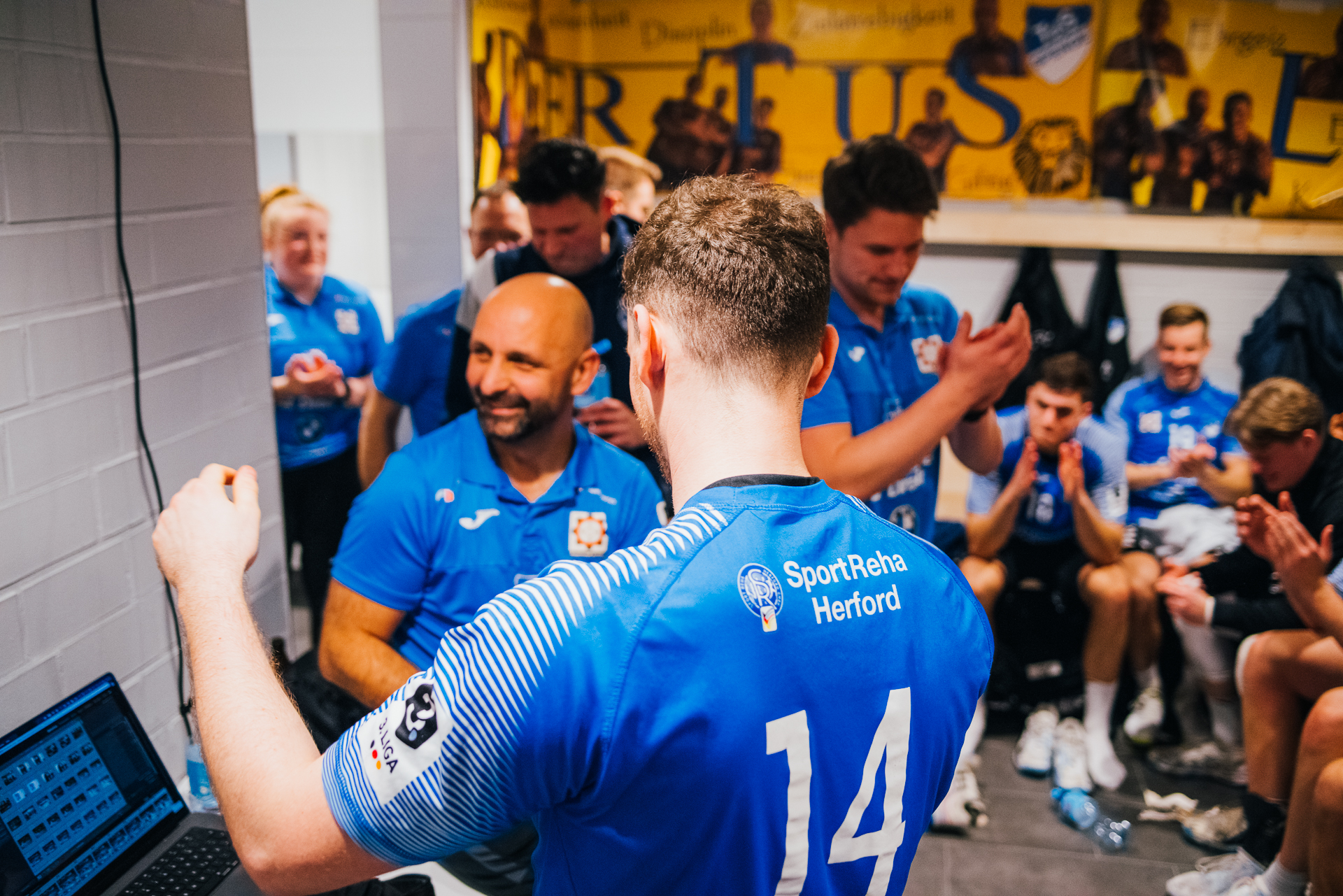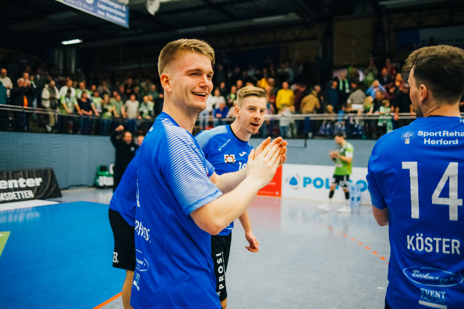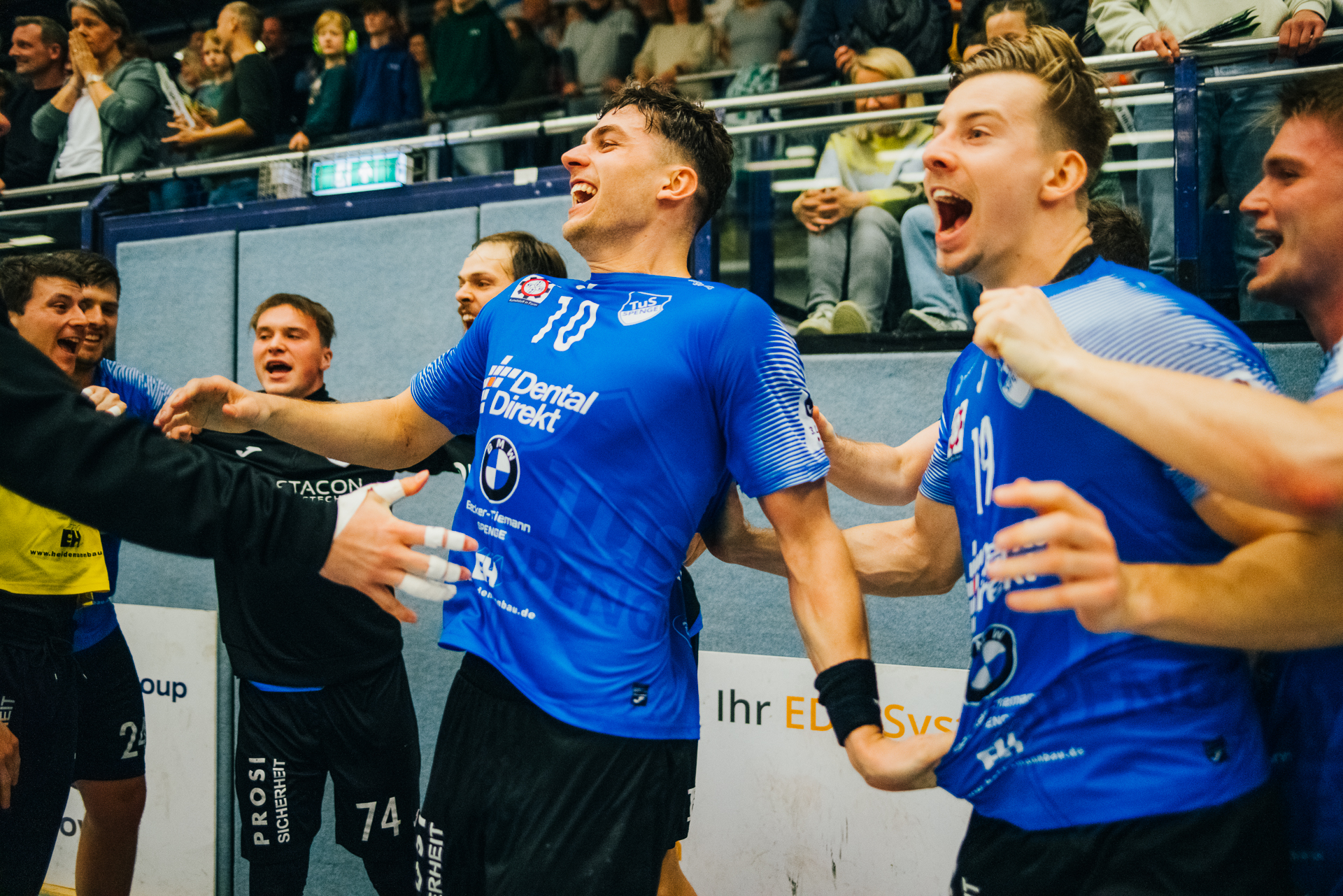 Spenge ließ sich davon nicht beirren und spielte weiter. In der 47. Spielminute war der Ausgleich dann da: Justus Aufderheide traf zum 27:27. Jetzt wurde das Spiel zu einem packendem Drittligaspiel. Der TVE ging immer wieder in Führung, Spenge hielt dagegen und markierte dann den Ausgleich. In dieser heißen Phase bekam Justus Aufderheide in der 57. Minute, beim Spielstand von 33:33 eine umstrittene 2-Minuten-Strafe. Doch Emsdetten nutzte diese Chance nicht. Aber der TuS war da. Bjarne Schulz traf zur ersten TuS-Führung im Spiel – 33:34. Die Spieluhr zeigte 58:24. Marian Orlowski vom TVE markierte 40 Sekunden vor dem End das 34:34. Auszeit TuS. 30 Sekunden blieben dem TuS für einen Torabschluß und auch jetzt wurde der Angriff wieder ruhig vorgetragen. Wenige Sekunden vor dem Ende lief Fabian Breuer mittig auf die Deckung, gab im Sprung an Vincent Hofmann ab. Hofmann warf und traf. Abpfiff. Auswärtssieg. Der TuS tanzte und feierte mit den mitgereisten Fans.