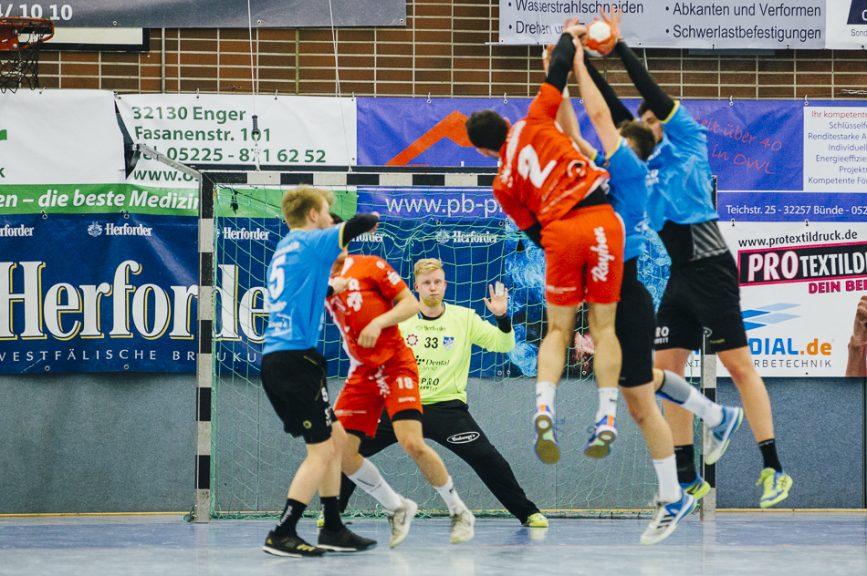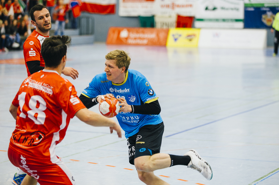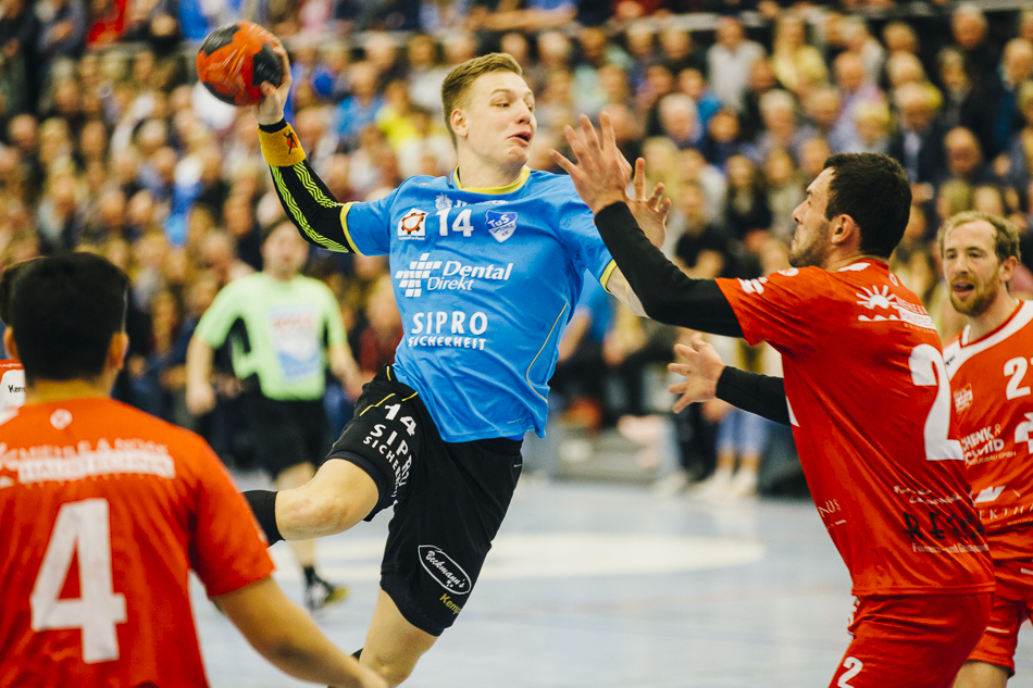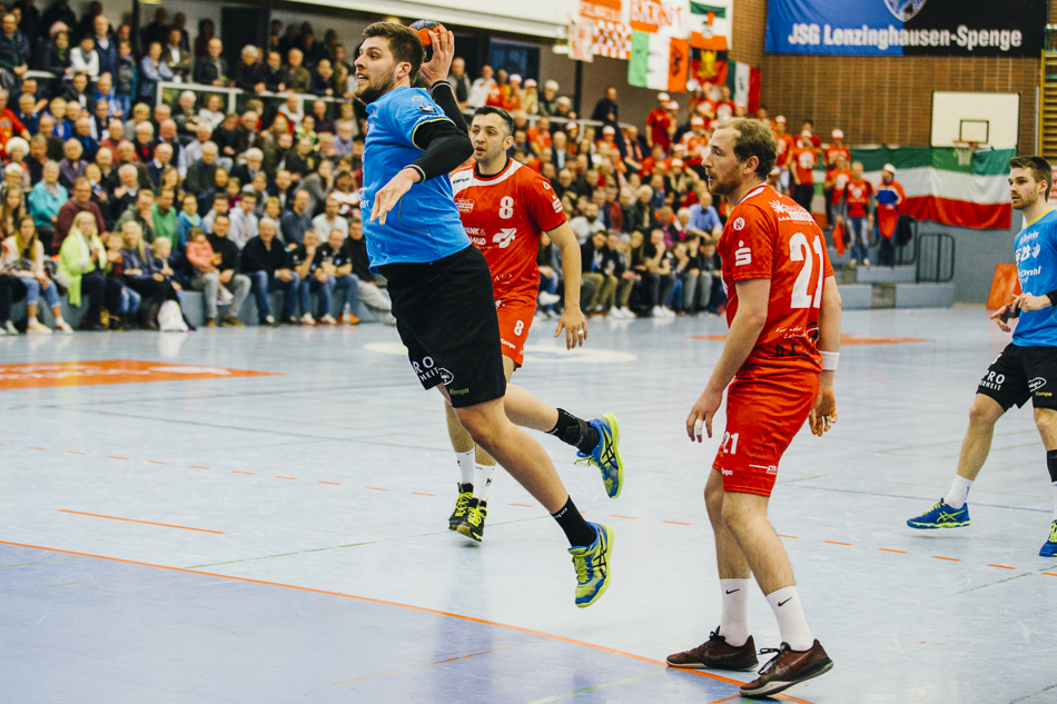 Spenge und Laupheim gingen mit Verletzungssorgen in diese Pokalpartie. Auf Spenger Seite musste Sebastian Reinsch und Marcel Ortjohann passen und auch Laupheim hatte einige Ausfälle von Stammpersonal zu beklagen. Zwar hatte sich unser Trainerteam mit Videomaterial auf den Gegner vorbereitet, ob der geplante Matchplan sich gegen die Laupheimer aber durchsetzen ließ, musste sich erst zeigen. Heiko Holtmann und Sebastian Cuhlmann hatten sich für eine 3:2:1 Deckung entschieden, im Tor machte Kevin Becker den Anfang. Die Rahmenbedingungen waren prima – trotz Osterurlaub war die Halle mit gut 650 Zuschauern gefüllt. Auch unsere Gäste aus Laupheim waren mit gut 70 Fans angereist und machten schon vor dem Anpfiff richtig Stimmung. Die ersten Minuten der Begegnung verliefen sehr ausgeglichen, über 1:1, 2:2 und 3:2. Dann zog der TuS jedoch das Tempo im Spiel deutlich an, zeigte in der Abwehr sehr schnelle Beine. Auch Kevin Becker im Tor war von der ersten Minute hellwach und überzeugte mit Paraden. Im Angriff schienen Holland, Kopschek, Wolff und Prüßner an die Leistungen der letzten Wochen anzuknüpfen und schraubten den Vorsprung auf ein 7:3 hoch. Die Gäste aus Laupheim nahmen nun ihre erste Auszeit, um sich neu einzustellen. Doch auch in der Folge brachte die Spenger Sieben eine hochkonzentrierte Leistung auf die Platte und die Pausenführung von 19:7 war sicherlich ein Vorentscheidung auf den Ausgang dieser Partie.