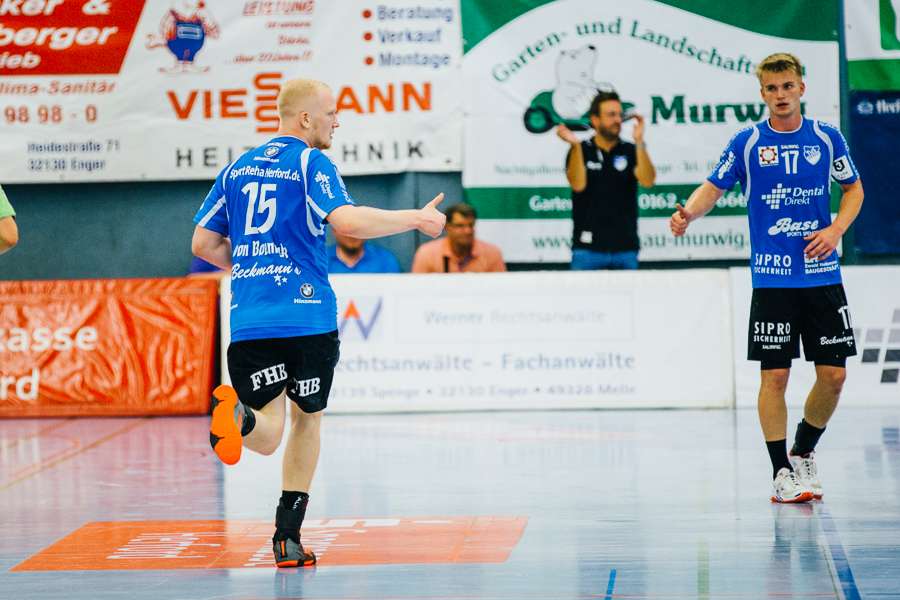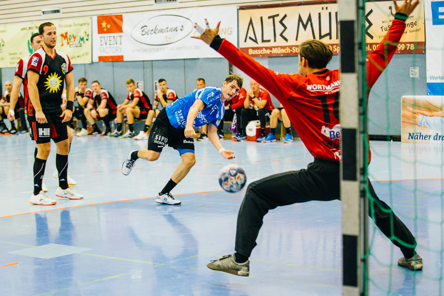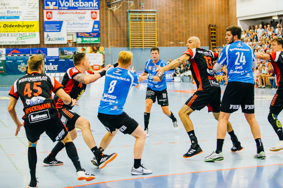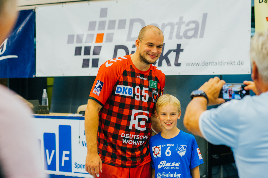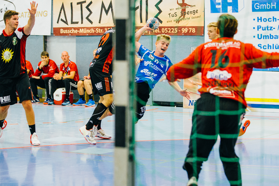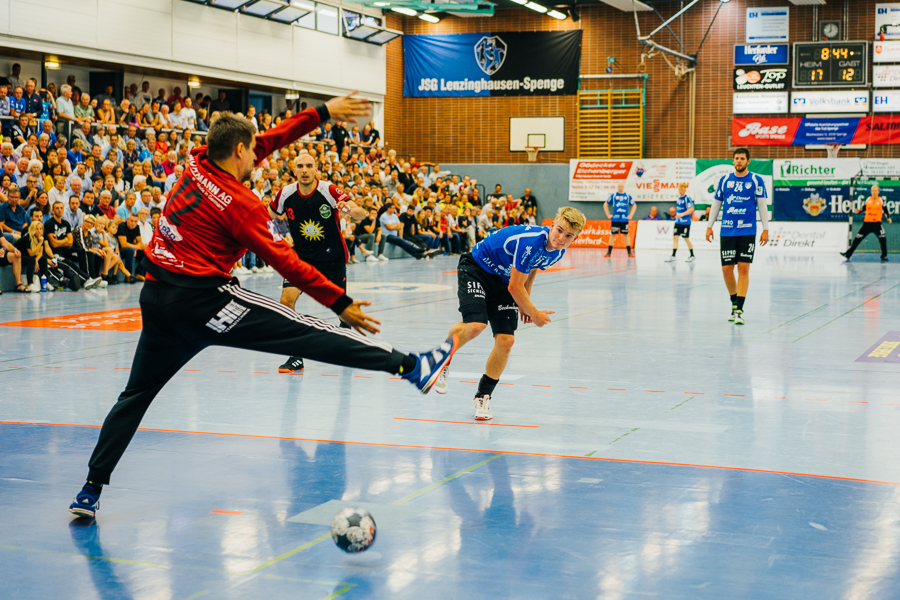 Unser TuS verliert gegen die Nachbarn aus Nettelstedt zwar deutlich mit 18:30 Toren, spielte dabei aber eine ganz hervorragende erste Halbzeit. Zwar ließ unser Trainer Heiko Holtmann auch nach dem Spiel in der Pressekonferenz die lange Verletztenliste nicht als Ausrede gelten, doch ohne den fehlenden Akteure Tesch, Holland, Harbert, Wolff, Brezina und L. Prüßner, schickte das Spenger Trainerteam einen ganz jungen Kader auf die Platte. Und die zeigten von Anfang an eine sehr engagierte und konzentrierte Leistung. Nimmt man alle Vorbereitungsspiele zusammen, so hatte sich die Spenger Sieben die beste Vorbereitungsleistung für dieses Spiel aufgespart. Denn was noch in der letzten Woche bei beiden Tests in Altenbeken und Baunatal noch nicht gut klappte – die Deckungsarbeit – klappte heute in den ersten 30 Minuten klasse. Spenge stellte eine sehr bewegliche 6:0 Deckung – die Nettelstedter wurden immer wieder ins Zeitspiel gezwungen. Bis zur 25. Spielminute hielt Spenge ein 9:9, führte zwischenzeitlich mit zwei Toren. Erst zum Ende der ersten Halbzeit konnten sich die Nettelstedter etwas befreien und warfen ein 10:12 heraus.