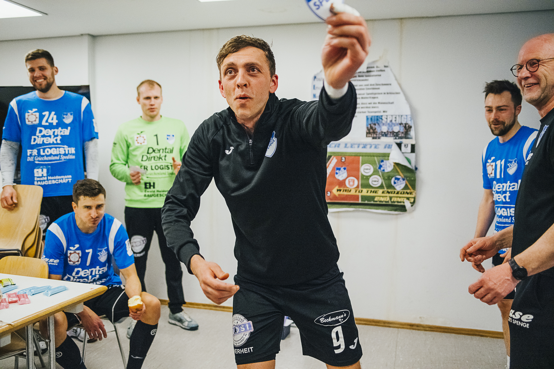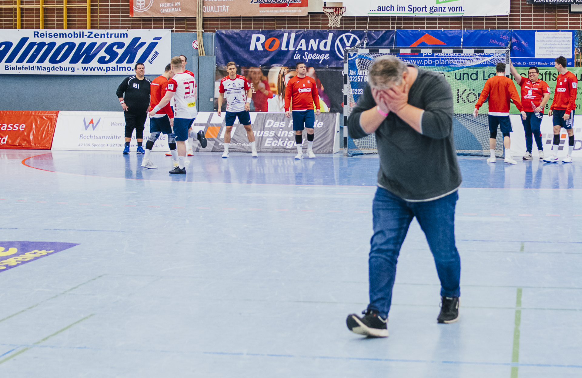 Auch in der zweiten Halbzeit war der Start wieder Drehbuch reif. Fünf Tore am Stück brachten eine 10 Tore Polster. Allein Maxi Schüttermeyer traf in dieser Phase dreimal. Alle hatte schon die Abschlussfeier vor Augen. Ahlen stellte auf eine 5:1 Deckung um – mit Erfolg. Besonders der Ahlener Til Colin Schmidt brachte den Spenger-Angriff im Lauf der zweiten Halbzeit durch diese taktische Variante immer mehr aus den Tritt. Heiko Holtmann nahm in der 40. Spielminute beim Spielstand von 26:19 die erste Auszeit und stimmte sein Team nochmal neu ein. Doch achten Minuten später musste Heiko Holtmann seine Mannen wieder zu sich zitieren. Das Torpolster war auf knappe 3 Tore geschmolzen und 12 Minuten waren noch zu spielen. Wut entbrannt gab der Spenger Coach seine Anweisungen – ohne Erfolg. David Spiekermann traf in der 55. Minute zum 31:31. Die Ahlener waren kurz davor die Abschlußparty zu crashen. Doch der heutige Drehbuchautor hatte anders geplant. Vincent Hofmann machte das wichtige 32:31 und Ahlens bester Mann David Spielermann bekam eine 2-Minuten Strafe. Jetzt fehlte nur noch eine Parade von Basti Räber oder Kevin Becker – das Drehbuch hatte aber etwas viel besseres vorgesehen. Ein Tor durch den Torwart Basti Räber ins leere Ahlener Tor. Damit war klar – Sieg und Partyalarm in Spenge.