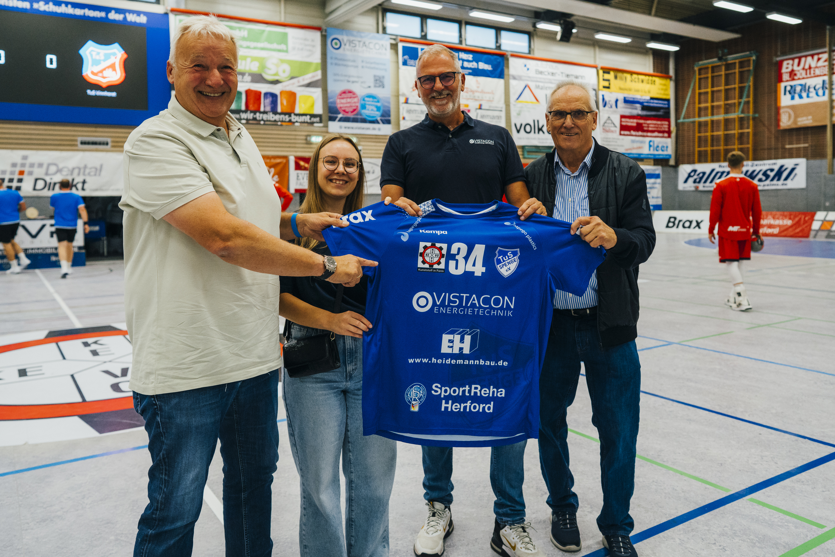 Vor dem ersten Heimspiel wurde der neue Trikotpartner, die Firma vistacon dem Spenger Publikum präsentiert (Foto von links: 2. Vorsitzender Gerhard de Boer, Laura Klarhorst – Technische Systemplanerin – , Bernd Barrenstern – Verkauf –, 1. Vorsitzender Horst Brinkmann)