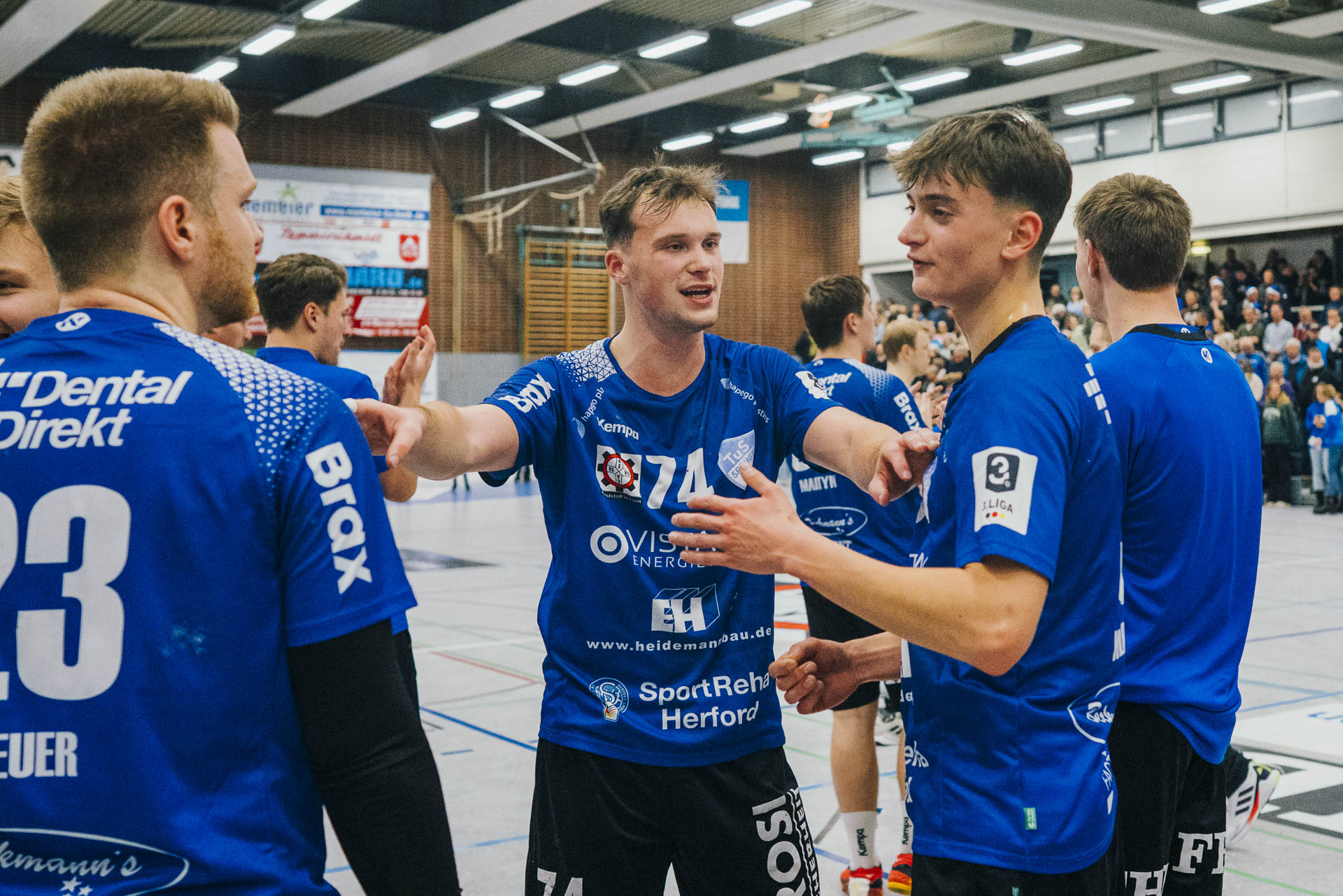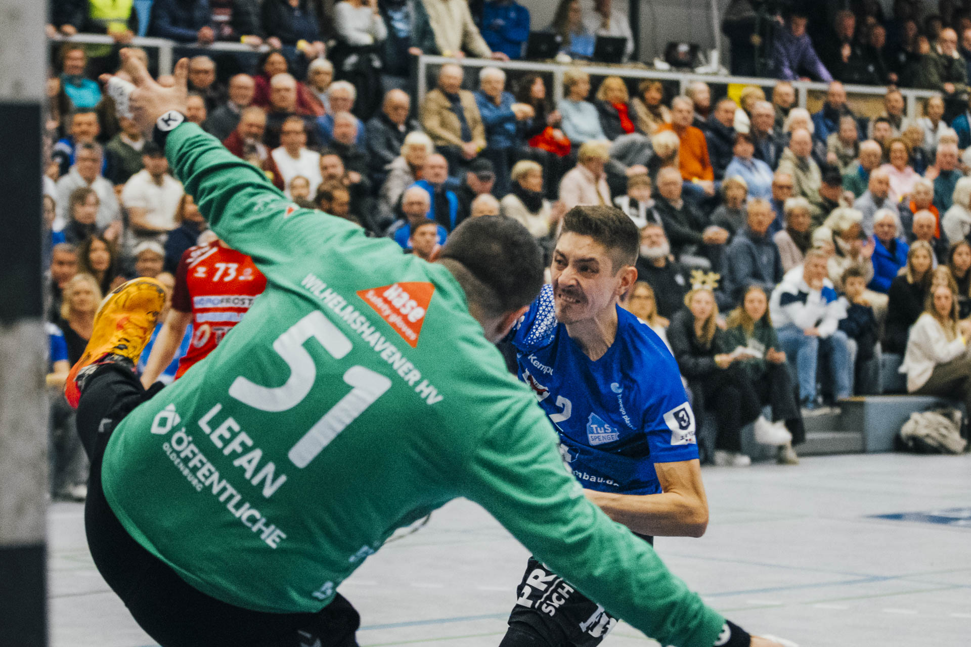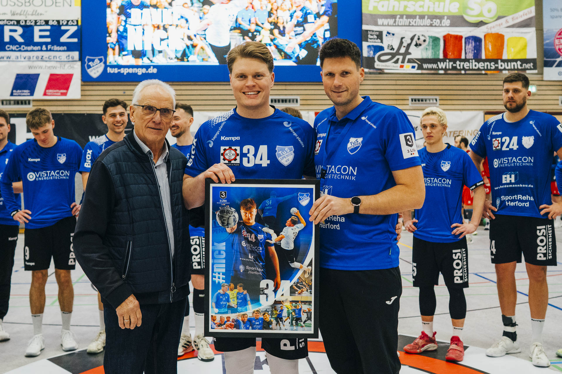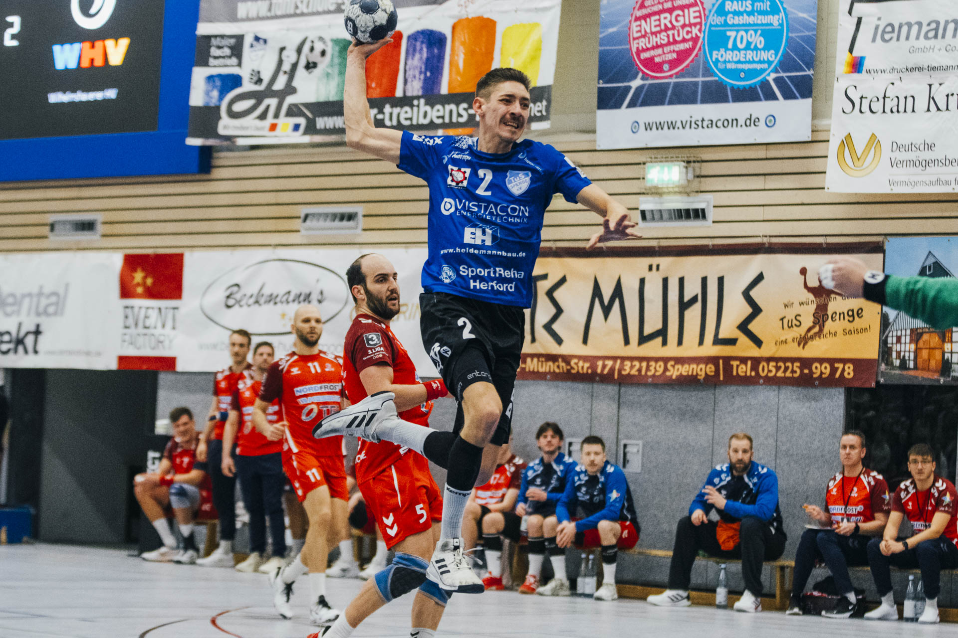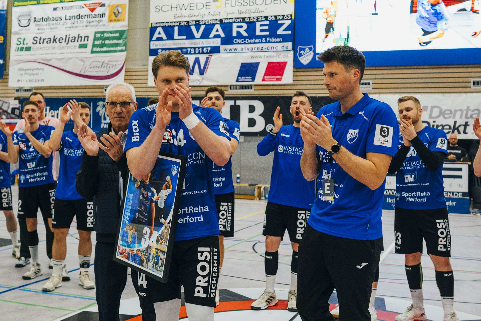 2. Halbzeit: Nach dem Seitenwechsel gestaltete sich das Spiel zunächst ausgeglichen. Fabian Breuer traf zweimal für den TuS Spenge, während Jakub Tóth auf Seiten des Wilhelmshavener HV ebenfalls doppelt erfolgreich war. In der 35. Minute war der Spenger Vorsprung jedoch auf fünf Tore geschmolzen, woraufhin der TuS eine Auszeit nahm. Eine sofortige Wirkung blieb jedoch aus, ohne dass der WHV entscheidend näher herankam. Beim Stand von 24:20 in der 43. Minute schien bei den Gästen kurzzeitig Hoffnung aufzukommen. Doch nun wurde die Deckung des TuS wieder deutlich stabiler, agierte aggressiver und ließ kaum noch klare Abschlüsse zu. Gleichzeitig erhöhte Spenge im Angriff das Tempo und nutzte Ballgewinne konsequent für schnelle Tore. In der Schlussphase rollte der TuS-Express erneut. Moritz Wilhelm stellte in der 53. Minute mit dem Treffer zum 31:24 die Weichen endgültig auf Sieg. Der Wilhelmshavener HV hatte dem nun nichts mehr entgegenzusetzen. Für einen emotionalen Höhepunkt sorgte Nick Heinsohn, der in der 58. Minute bei seinem Abschiedsspiel selbst noch zum 36:27 traf. Den Schlusspunkt setzte schließlich Theodor Theuteberg, der mit dem Treffer zum 38:27 das letzte Tor des Jahres im schönsten Schuhkarton von Spenge erzielte.