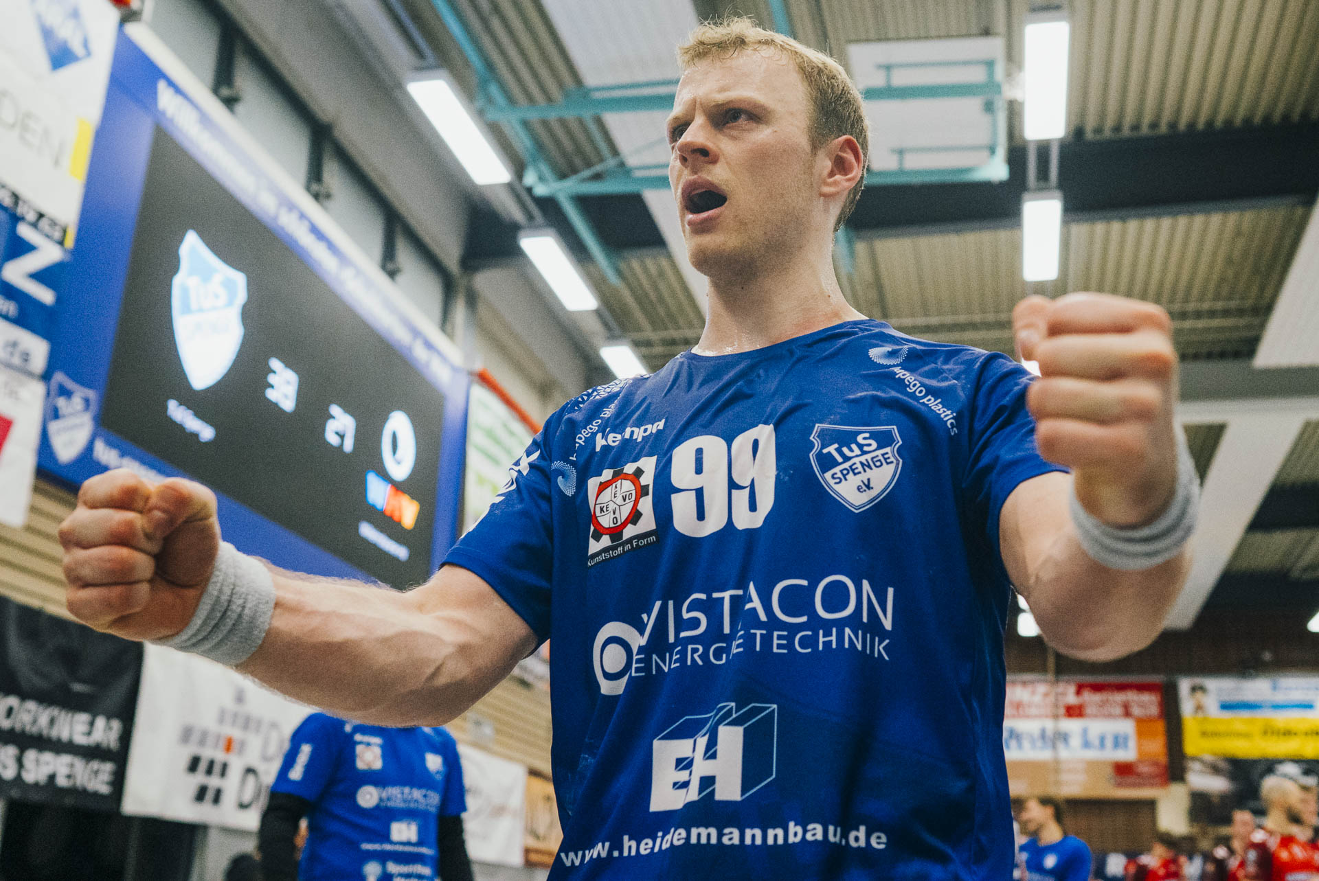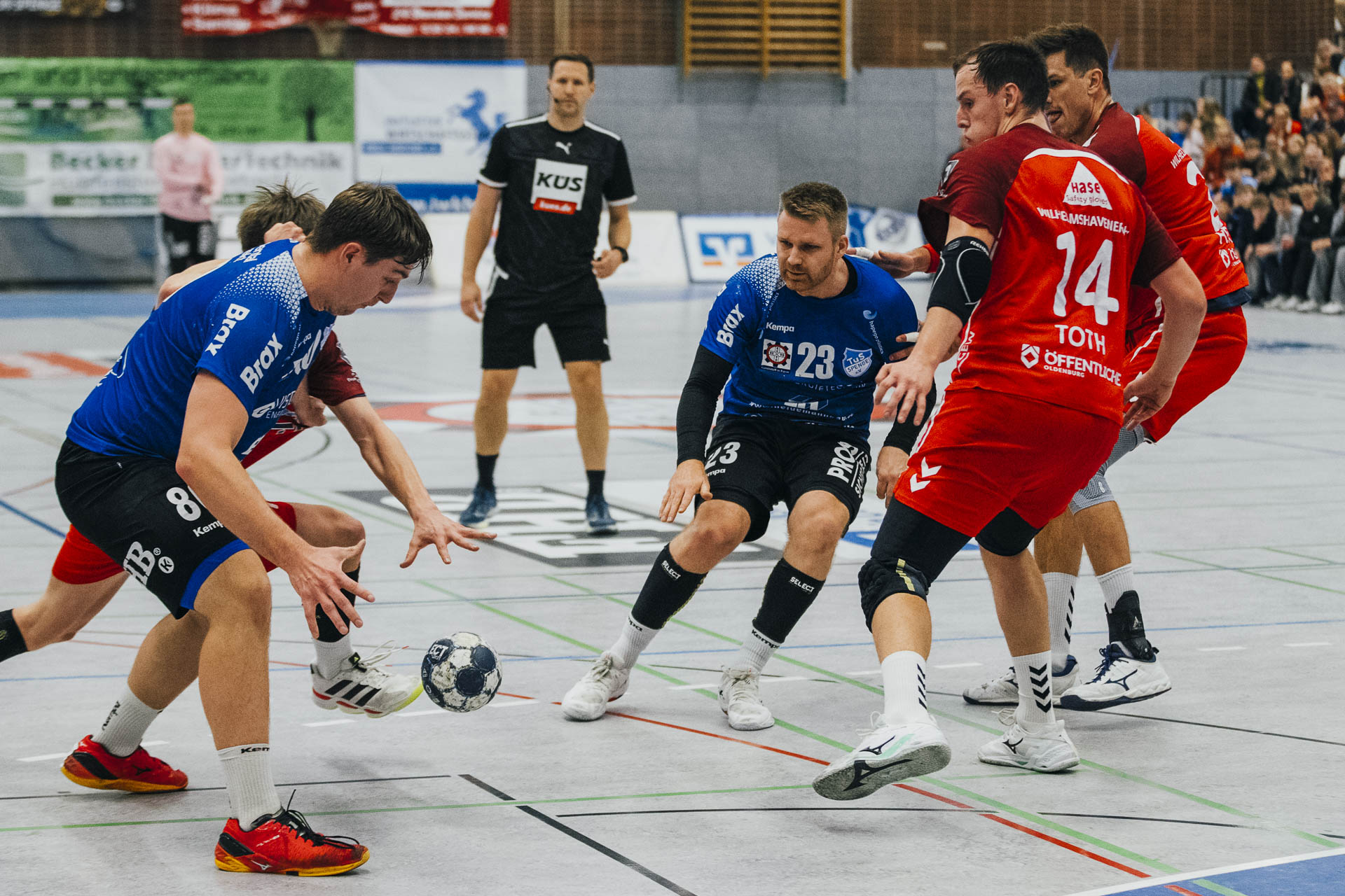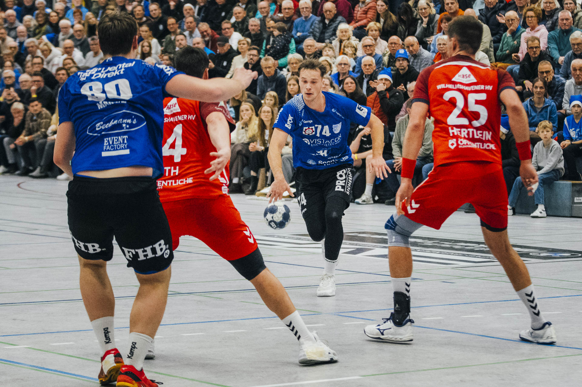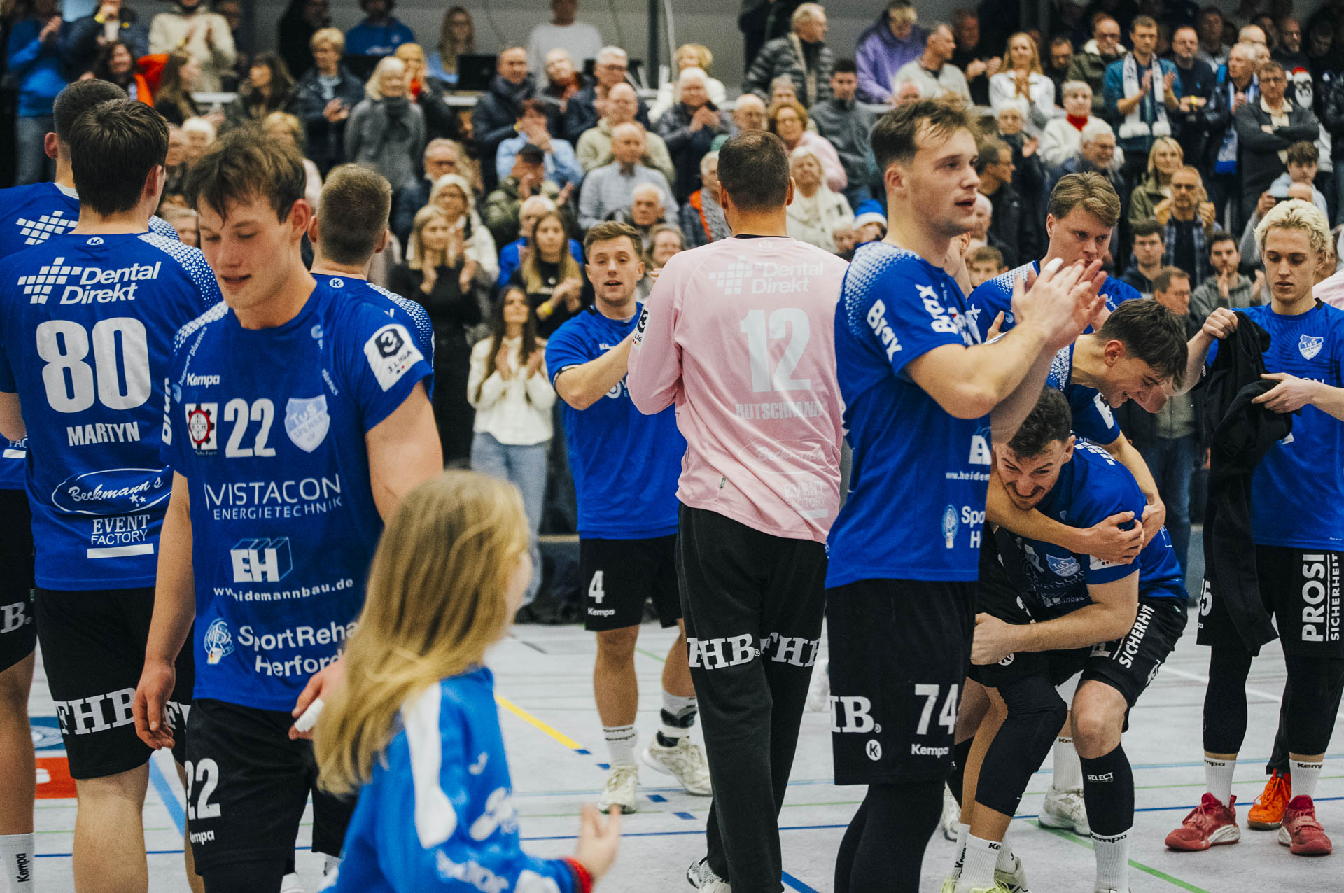 2. Halbzeit: Nach dem Seitenwechsel gestaltete sich das Spiel zunächst ausgeglichen. Fabian Breuer traf zweimal für den TuS Spenge, während Jakub Tóth auf Seiten des Wilhelmshavener HV ebenfalls doppelt erfolgreich war. In der 35. Minute war der Spenger Vorsprung jedoch auf fünf Tore geschmolzen, woraufhin der TuS eine Auszeit nahm. Eine sofortige Wirkung blieb jedoch aus, ohne dass der WHV entscheidend näher herankam. Beim Stand von 24:20 in der 43. Minute schien bei den Gästen kurzzeitig Hoffnung aufzukommen. Doch nun wurde die Deckung des TuS wieder deutlich stabiler, agierte aggressiver und ließ kaum noch klare Abschlüsse zu. Gleichzeitig erhöhte Spenge im Angriff das Tempo und nutzte Ballgewinne konsequent für schnelle Tore. In der Schlussphase rollte der TuS-Express erneut. Moritz Wilhelm stellte in der 53. Minute mit dem Treffer zum 31:24 die Weichen endgültig auf Sieg. Der Wilhelmshavener HV hatte dem nun nichts mehr entgegenzusetzen. Für einen emotionalen Höhepunkt sorgte Nick Heinsohn, der in der 58. Minute bei seinem Abschiedsspiel selbst noch zum 36:27 traf. Den Schlusspunkt setzte schließlich Theodor Theuteberg, der mit dem Treffer zum 38:27 das letzte Tor des Jahres im schönsten Schuhkarton von Spenge erzielte.