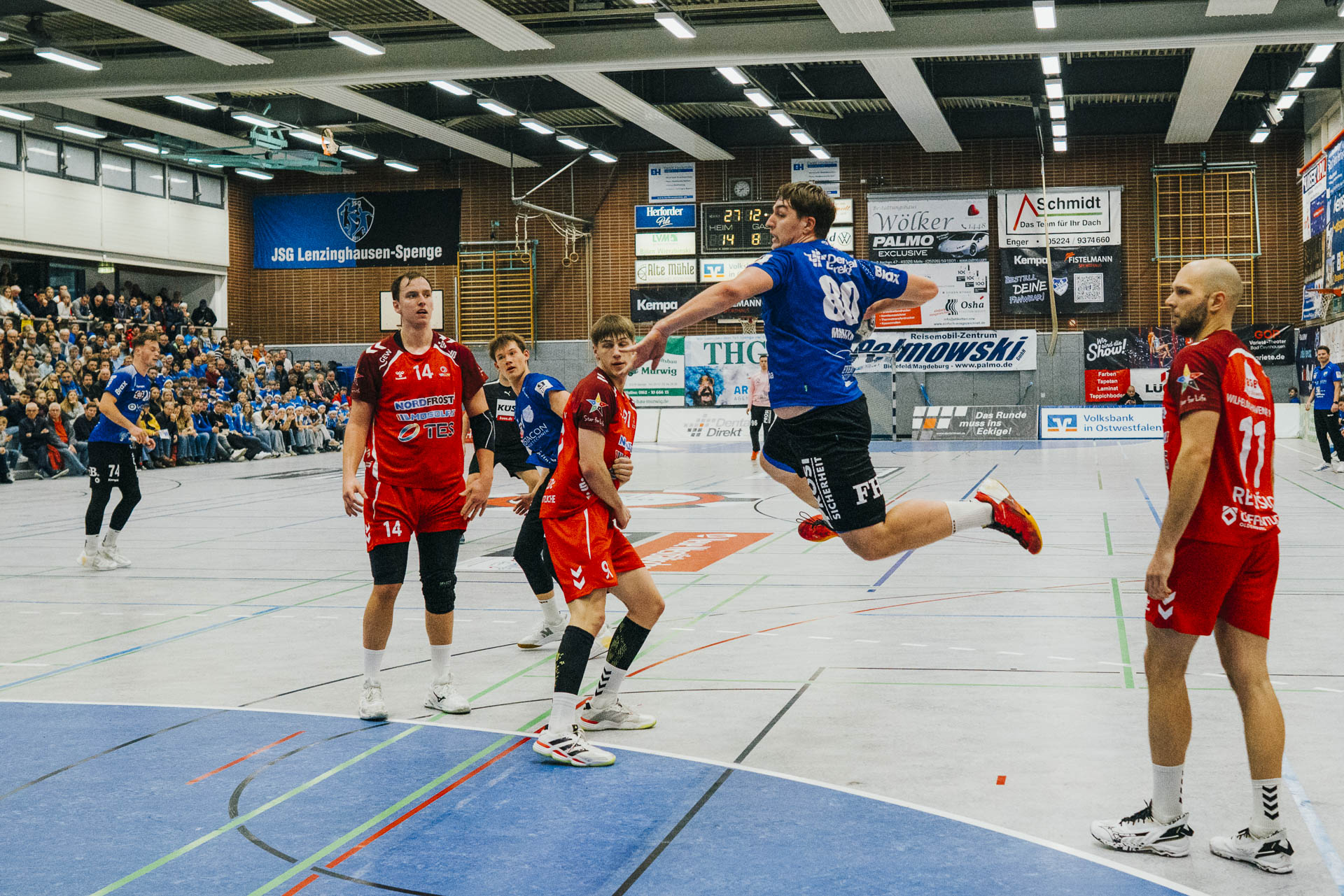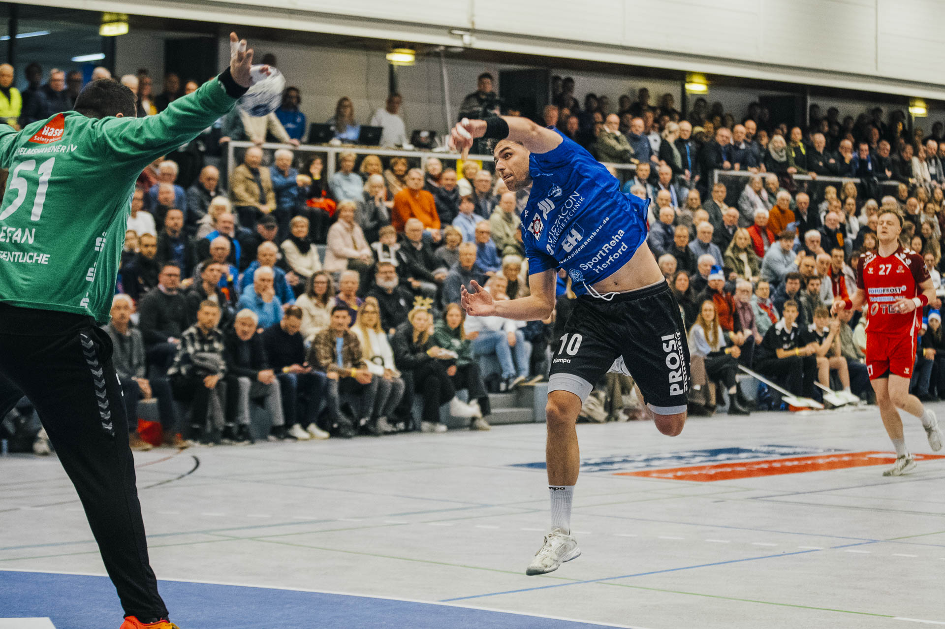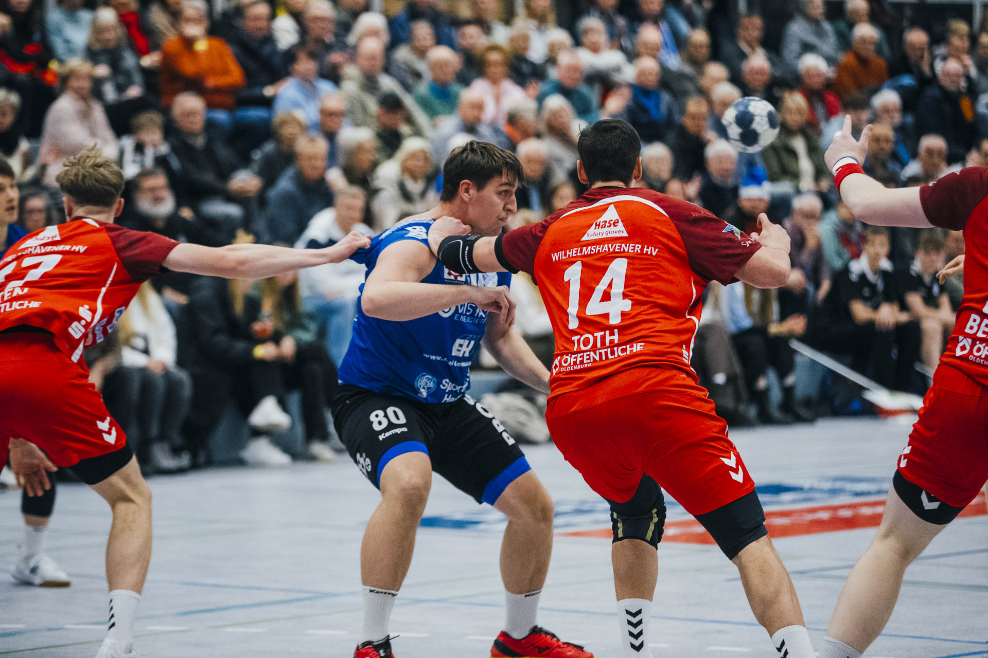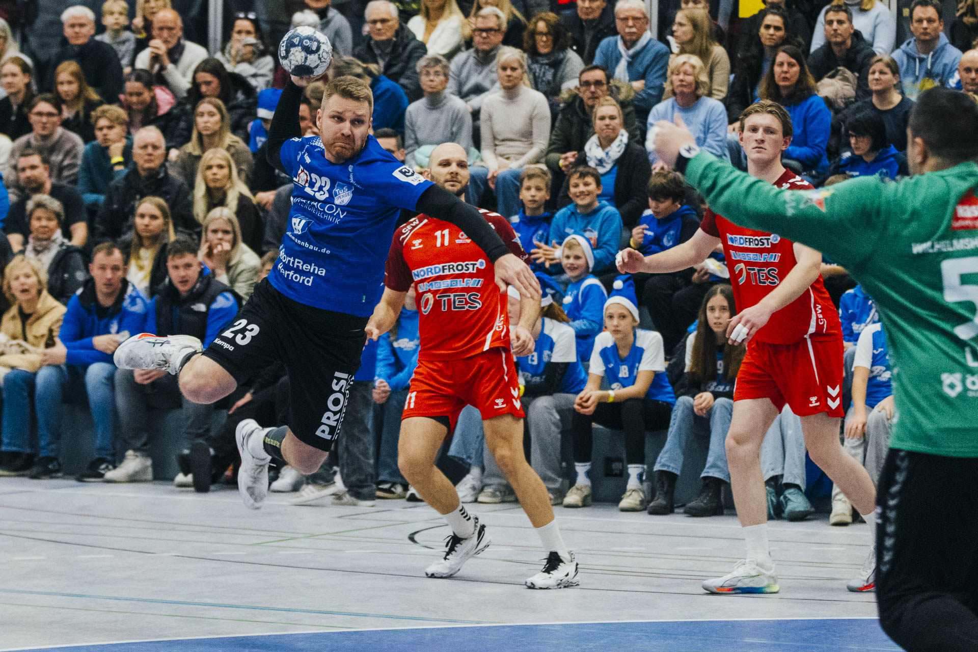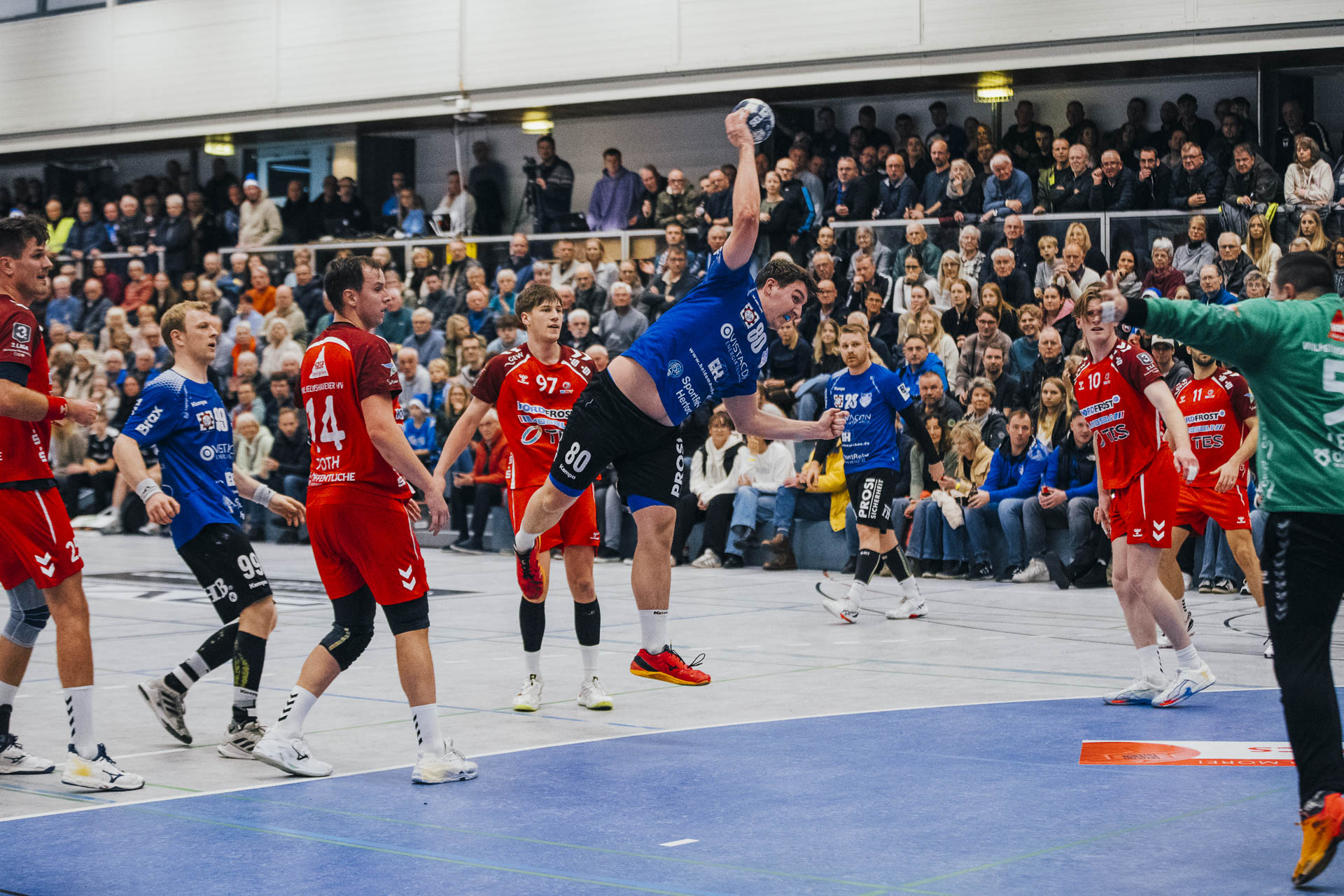 2. Halbzeit: Nach dem Seitenwechsel gestaltete sich das Spiel zunächst ausgeglichen. Fabian Breuer traf zweimal für den TuS Spenge, während Jakub Tóth auf Seiten des Wilhelmshavener HV ebenfalls doppelt erfolgreich war. In der 35. Minute war der Spenger Vorsprung jedoch auf fünf Tore geschmolzen, woraufhin der TuS eine Auszeit nahm. Eine sofortige Wirkung blieb jedoch aus, ohne dass der WHV entscheidend näher herankam. Beim Stand von 24:20 in der 43. Minute schien bei den Gästen kurzzeitig Hoffnung aufzukommen. Doch nun wurde die Deckung des TuS wieder deutlich stabiler, agierte aggressiver und ließ kaum noch klare Abschlüsse zu. Gleichzeitig erhöhte Spenge im Angriff das Tempo und nutzte Ballgewinne konsequent für schnelle Tore. In der Schlussphase rollte der TuS-Express erneut. Moritz Wilhelm stellte in der 53. Minute mit dem Treffer zum 31:24 die Weichen endgültig auf Sieg. Der Wilhelmshavener HV hatte dem nun nichts mehr entgegenzusetzen. Für einen emotionalen Höhepunkt sorgte Nick Heinsohn, der in der 58. Minute bei seinem Abschiedsspiel selbst noch zum 36:27 traf. Den Schlusspunkt setzte schließlich Theodor Theuteberg, der mit dem Treffer zum 38:27 das letzte Tor des Jahres im schönsten Schuhkarton von Spenge erzielte.