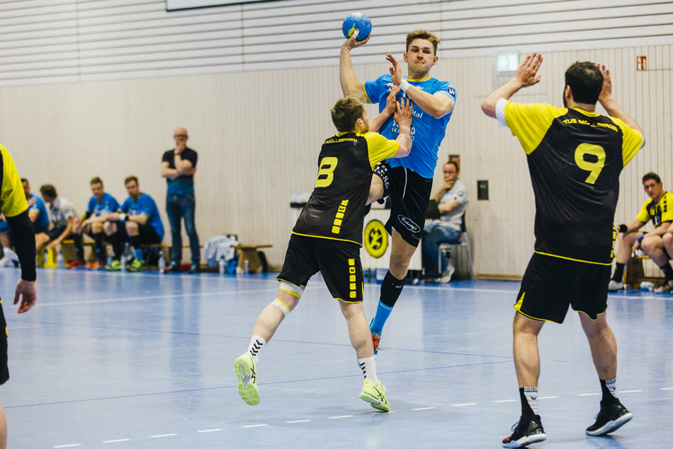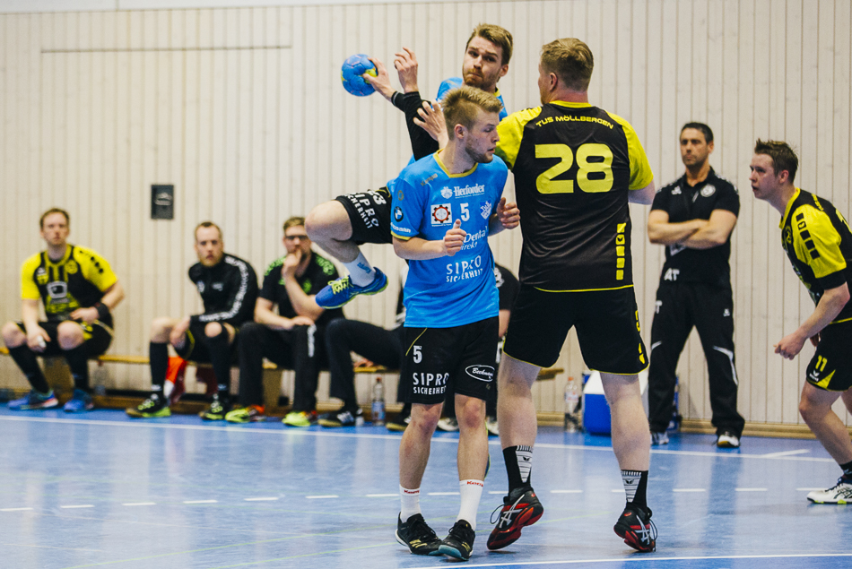 Das die mahnenden Worte der Trainingswoche bei der Sieben auf der Platte angekommen waren, war von Anfang an zu spüren. Die Deckung um den Mittelblock Gräfe/Tesch agierte von Anfang an sehr wach und aggressiv. Man war immer in der Lage, die Möllberger Angriffe durch schnelle Beine in der Deckung im Keim zu ersticken, schnell wurde sich jede auftuende Lücke zugeschoben. Und sollte dann einmal ein Möllberger Spieler zum Wurfabschluss gekommen sein, stand mit Kevin Becker ein bestens aufgelegter Torhüter zwischen den Pfosten. Gerade einmal einen Ballverlust konnte der TuS Angriff bei den ersten 11 Versuchen verzeichnen. Das Ergebnis war eine 4:12 Führung für den TuS und die erste Auszeit der Heimmannschaft aus Möllbergen. Auch nach dem Break lief es für den TuS aber weiter wie am Schnürchen. Was man sich auf Möllberger Seite auch an taktischen Mitteln ausdachte, die Sieben von Heiko Holtmann und Sebastian Cuhlmann hatte auf alles eine Antwort. Mit einem 8:17 ging es in die Pause und ehrlich gesagt, hatte man bei Spielern und Fans auf Möllberger Seite nicht den Eindruck, als wenn man noch an die Wende glaubte.