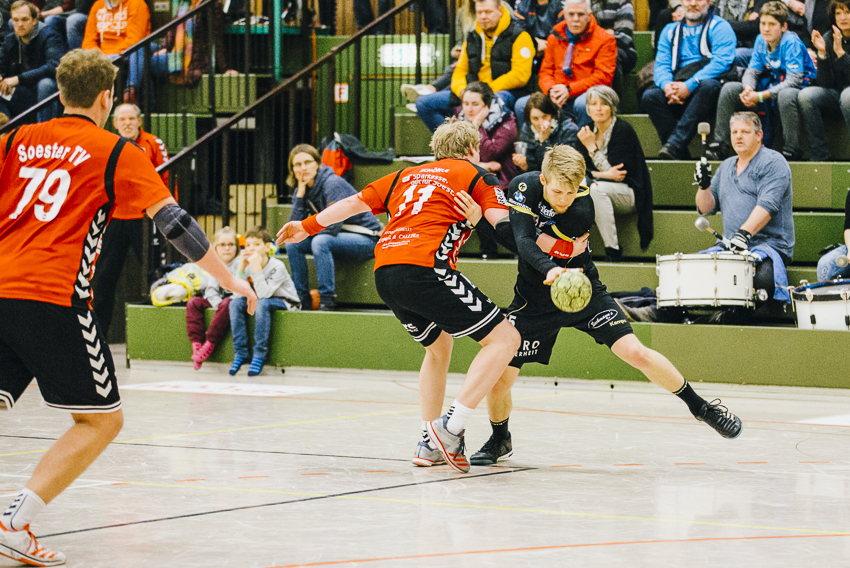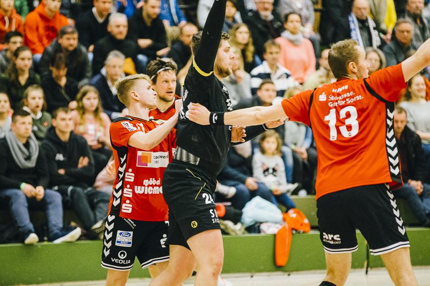 Unser TuS erwischte einen guten Start und konnte eine 0:2 Führung vorlegen. Wie erwartet agierten die Gastgeber ab der 10. Minute dauerhaft mit einem siebten Feldspieler. Zwar stand die Spenger 6:0 Deckung sehr solide, Bastian Räber im Tor konnte einige Bälle entschärfen und trotzdem kämpfte sich Soest heran. In der 25. Minute konnten die Hausherren unter dem Jubel der gut 400 Zuschauer das erste Mal mit 9:8 in Führung gehen. Mit einem 10:9 Tore-Vorsprung ging es in die Pause.